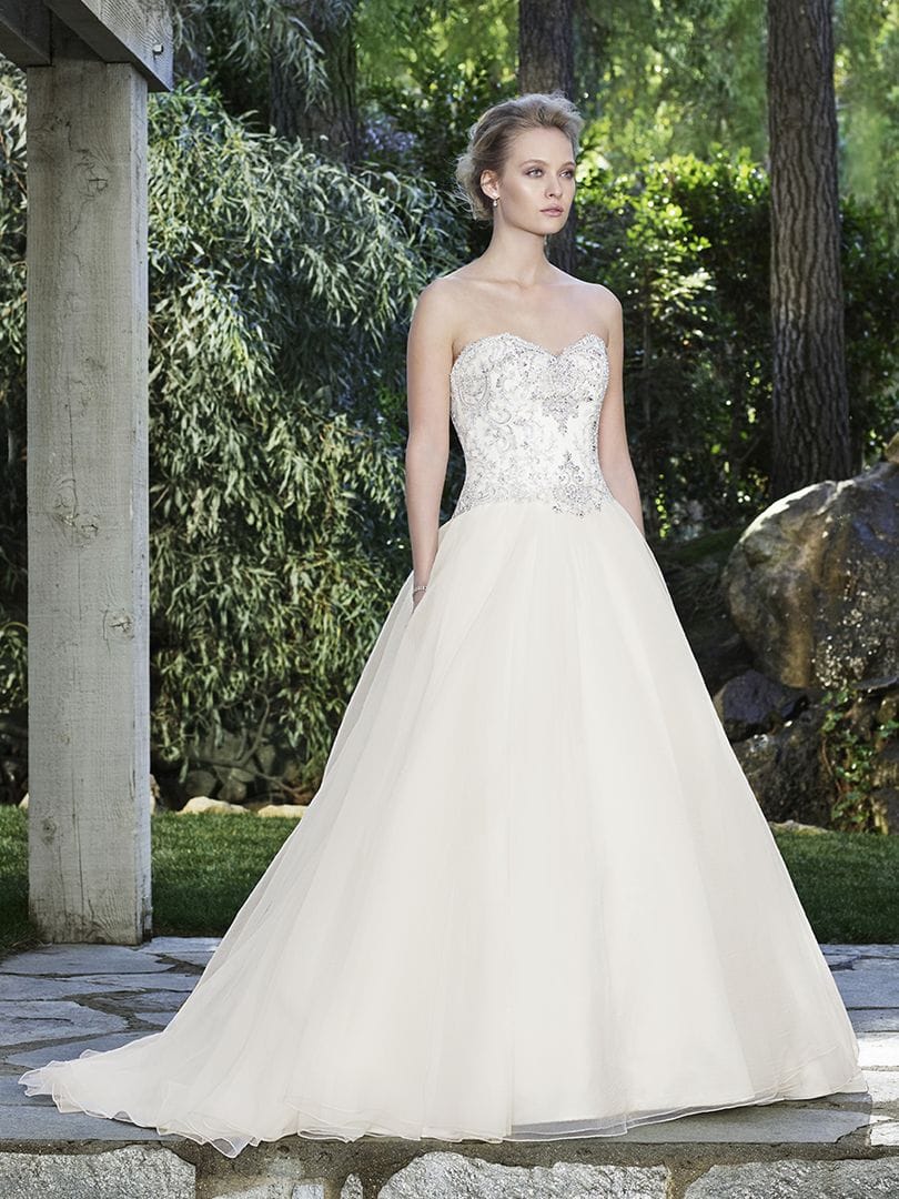 Casablanca 2249 is a romantic tulle ball gown featuring a detailed, strapless bodice! This gown comes to us in fair condition from a designer boutique. There are oxidized beads. Casablanca 2249 is Ivory in color and a size 10.