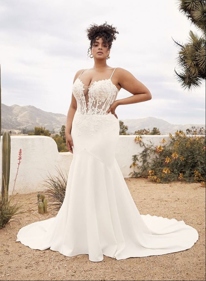 Casablanca BL442 is a stunning crepe sheath wedding dress featuring a plunge neckline + chapel-length train! This gown comes to us in great condition from a designer boutique. Casablanca BL442 is Ivory in color and a size 26.