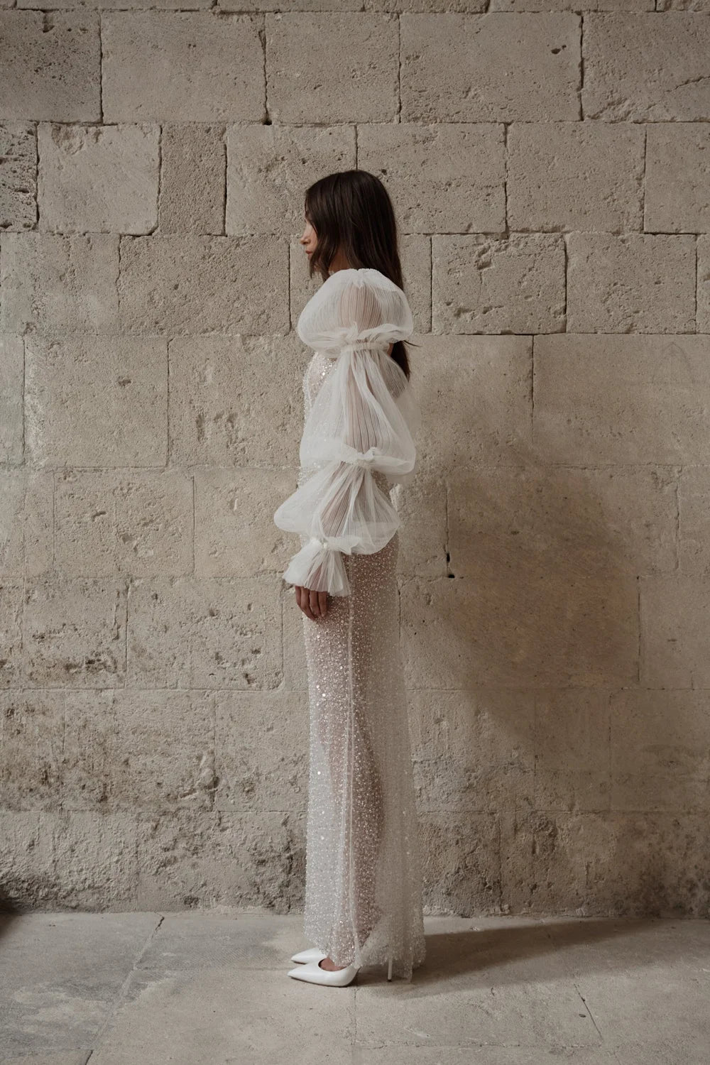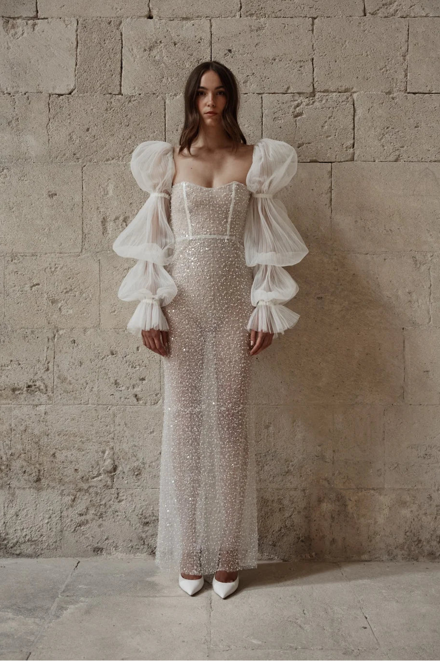 Christie Nicole Bridal Stella is a jaw-dropping beaded sheath wedding dress featuring dramatic puffed long sleeves! Please note, our gown is lined. This gown comes to us in great condition from a designer boutique. Christie Nicole Bridal Stella is Ivory in color and a size 10.