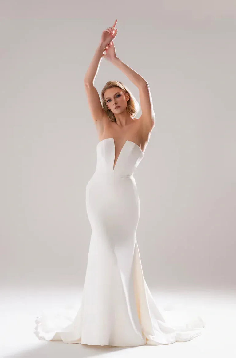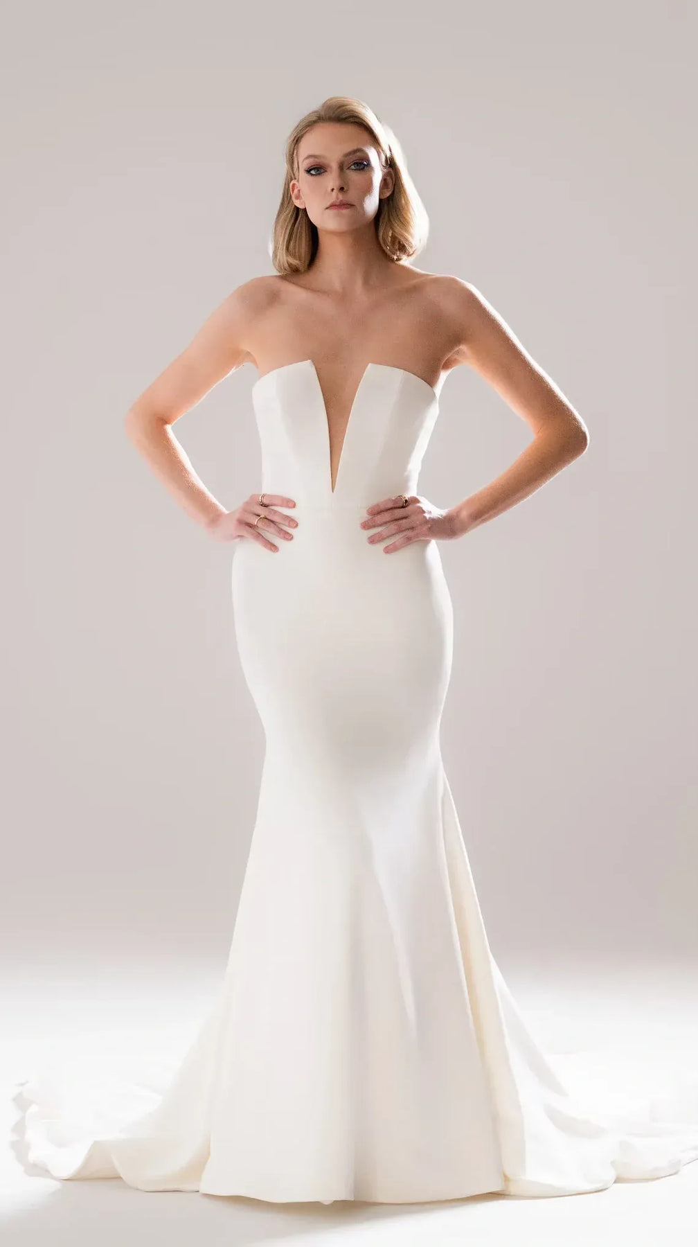 Colby John Clara is a modern crepe fit and flare wedding dress featuring a plunging V neckline! This gown comes to us in fair condition from a designer boutique. Cleaning is needed on the underarms, back, + hem, + the eye needs replaced. Colby John Clara is Ivory in color and a size 18.