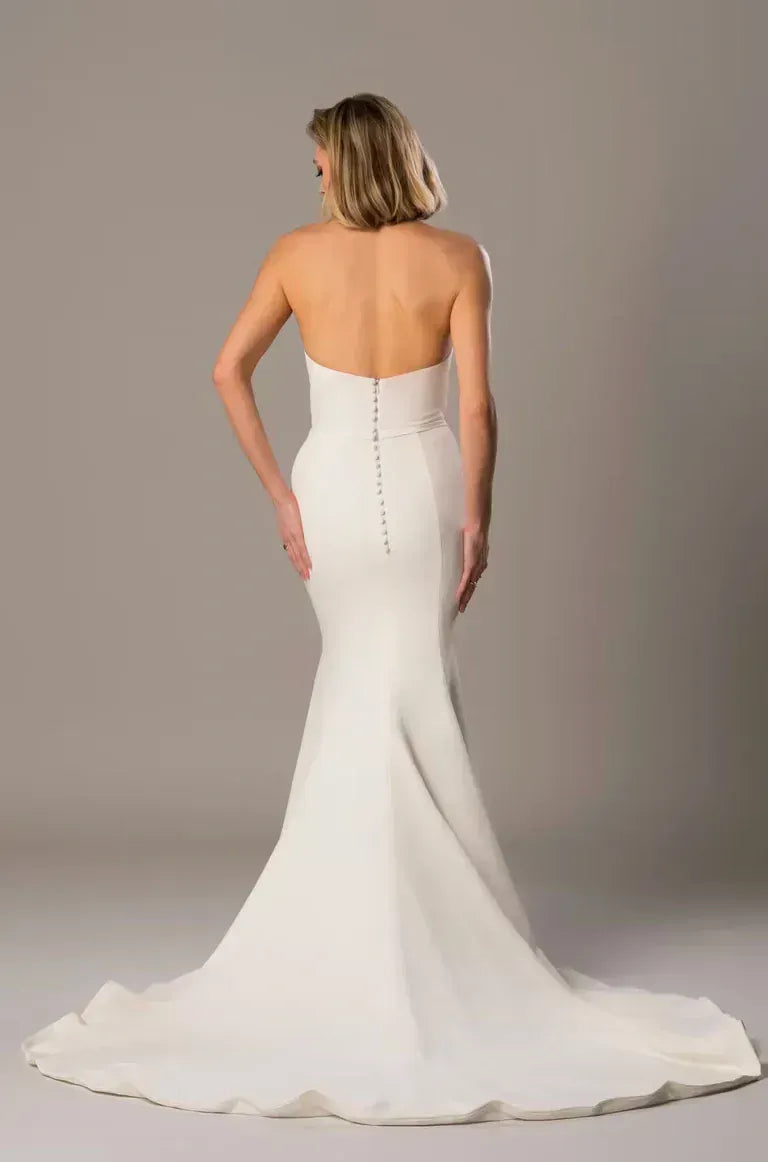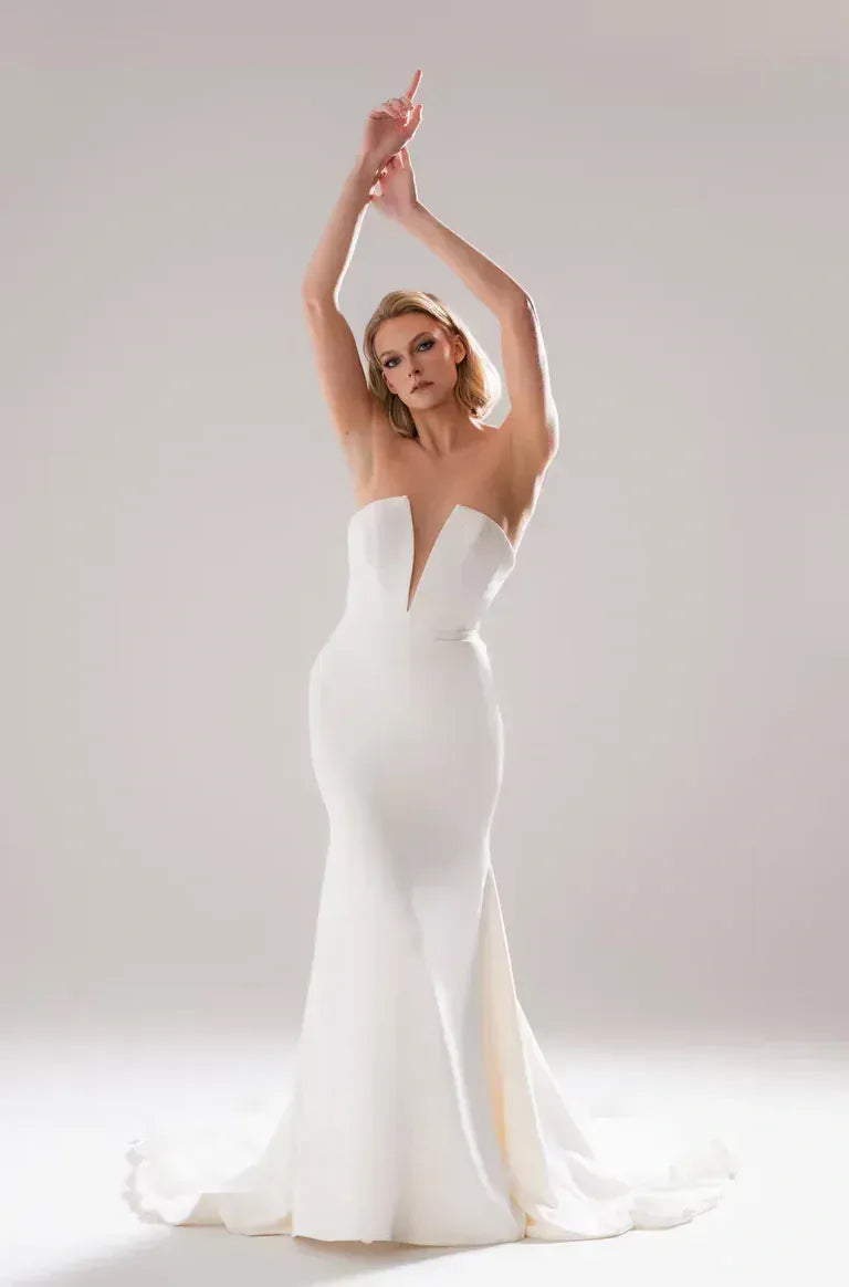 Colby John Clara is a modern crepe fit and flare wedding dress featuring a plunging V neckline! This gown comes to us in fair condition from a designer boutique. Cleaning is needed on the underarms, back, + hem, + the eye needs replaced. Colby John Clara is Ivory in color and a size 18.