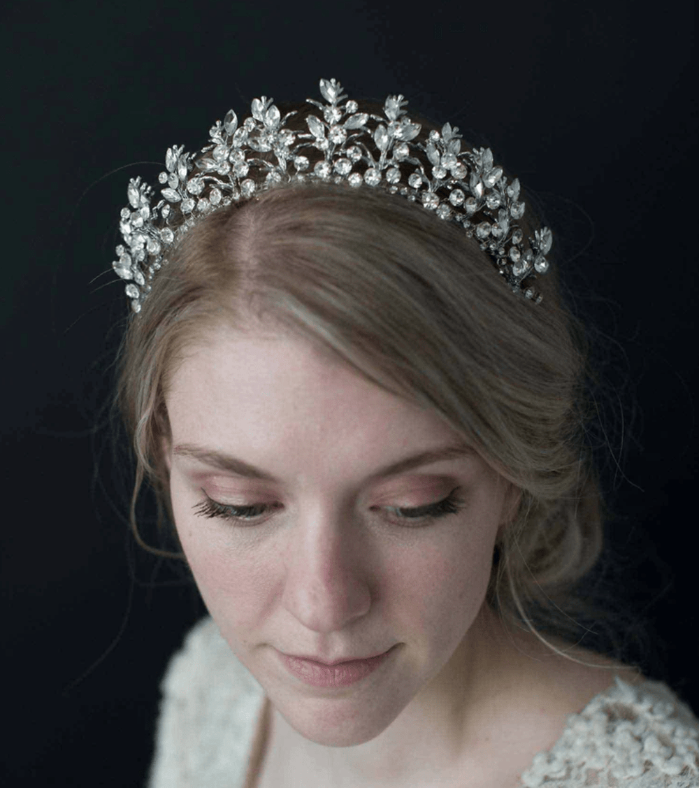 Twigs & Honey 754 Tiara is a timeless and romantic tiara with crystals + gold plated fern charms. This gorgeous style is perfect for creating a modern princess look; with just enough height + sparkle!