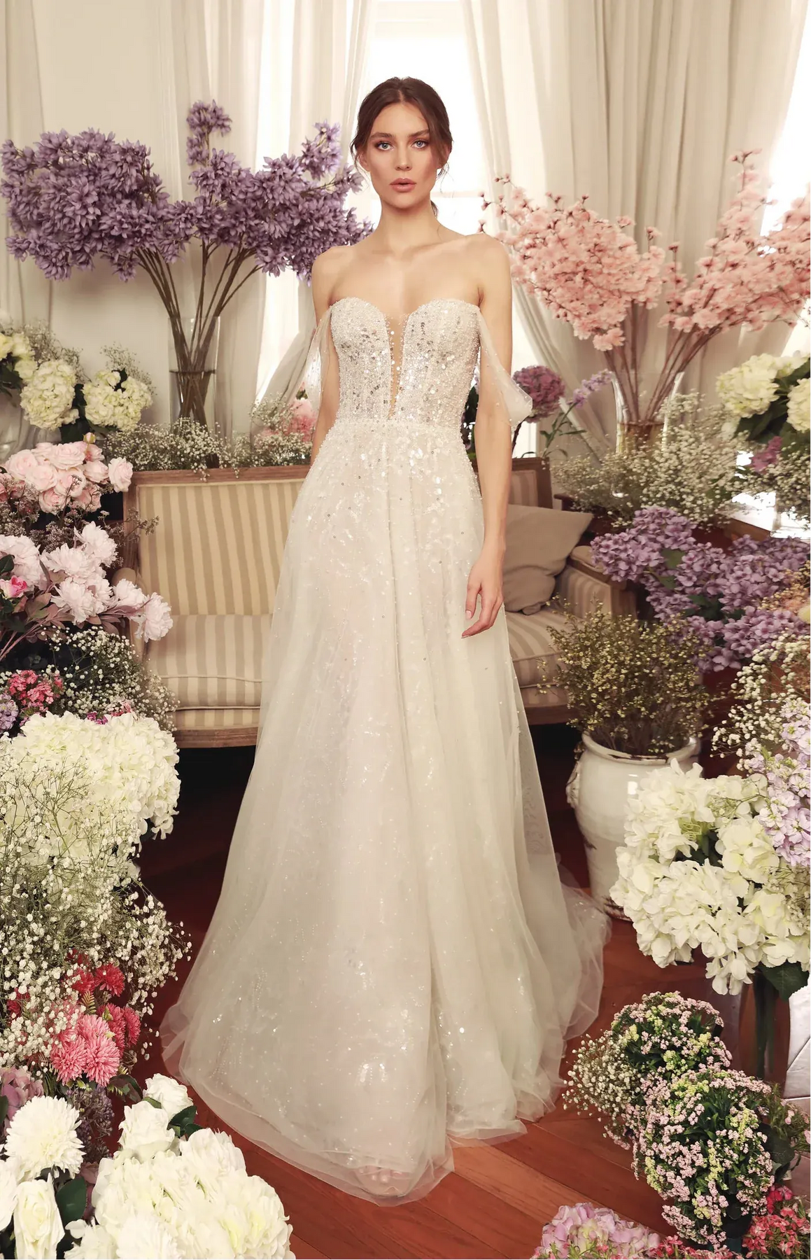 Dany Tabet Beatrix is a sparkly tulle A-line wedding dress featuring cascading beading + a sweetheart neckline! This gown comes to us in great condition from a designer boutique. Dany Tabet Beatrix is Ivory/Dark Nude in color and a size 12.