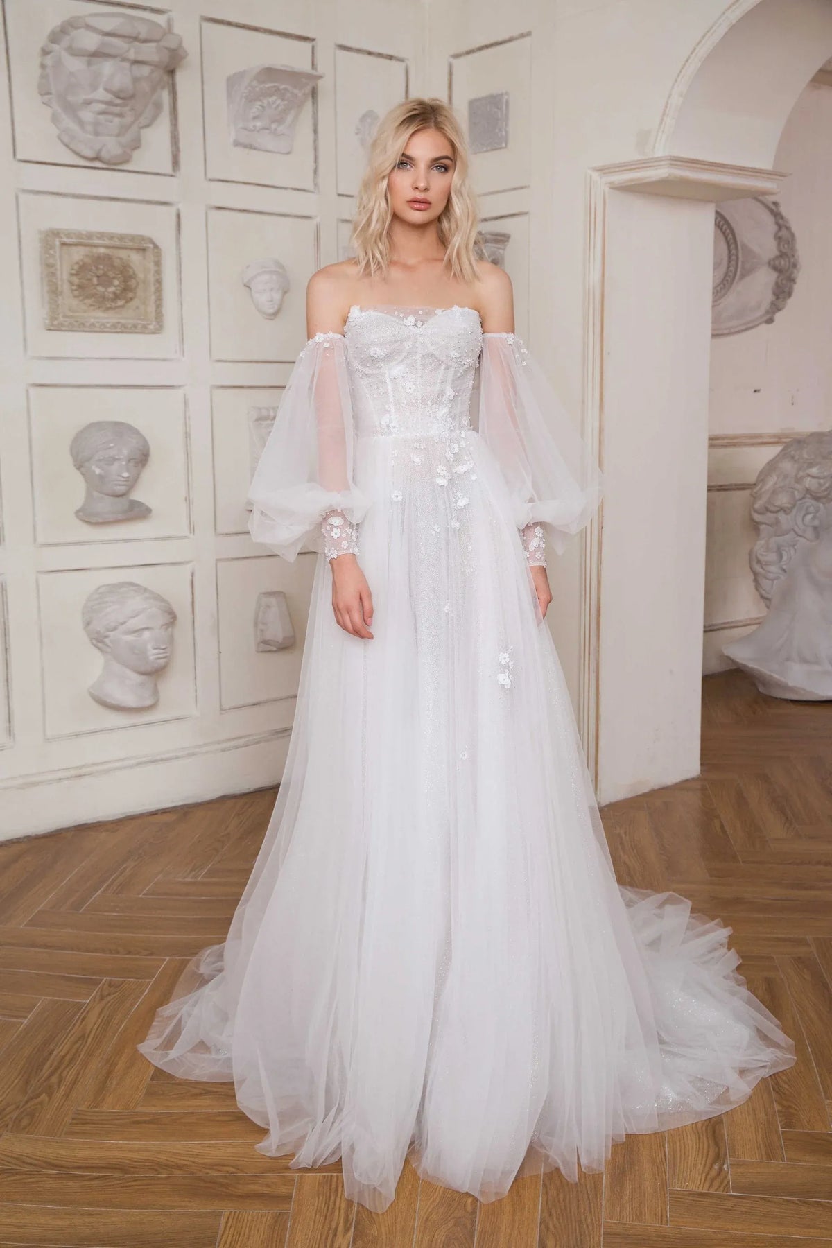 Dany Tabet Nyx is a sparkly tulle A-line wedding dress with cascading floral appliqués + pull-on puffed long sleeves! This gown comes to us in great condition from a designer boutique. A cup needs retacked. Dany Tabet Nyx is Ivory/Dark Nude in color and a size 10.