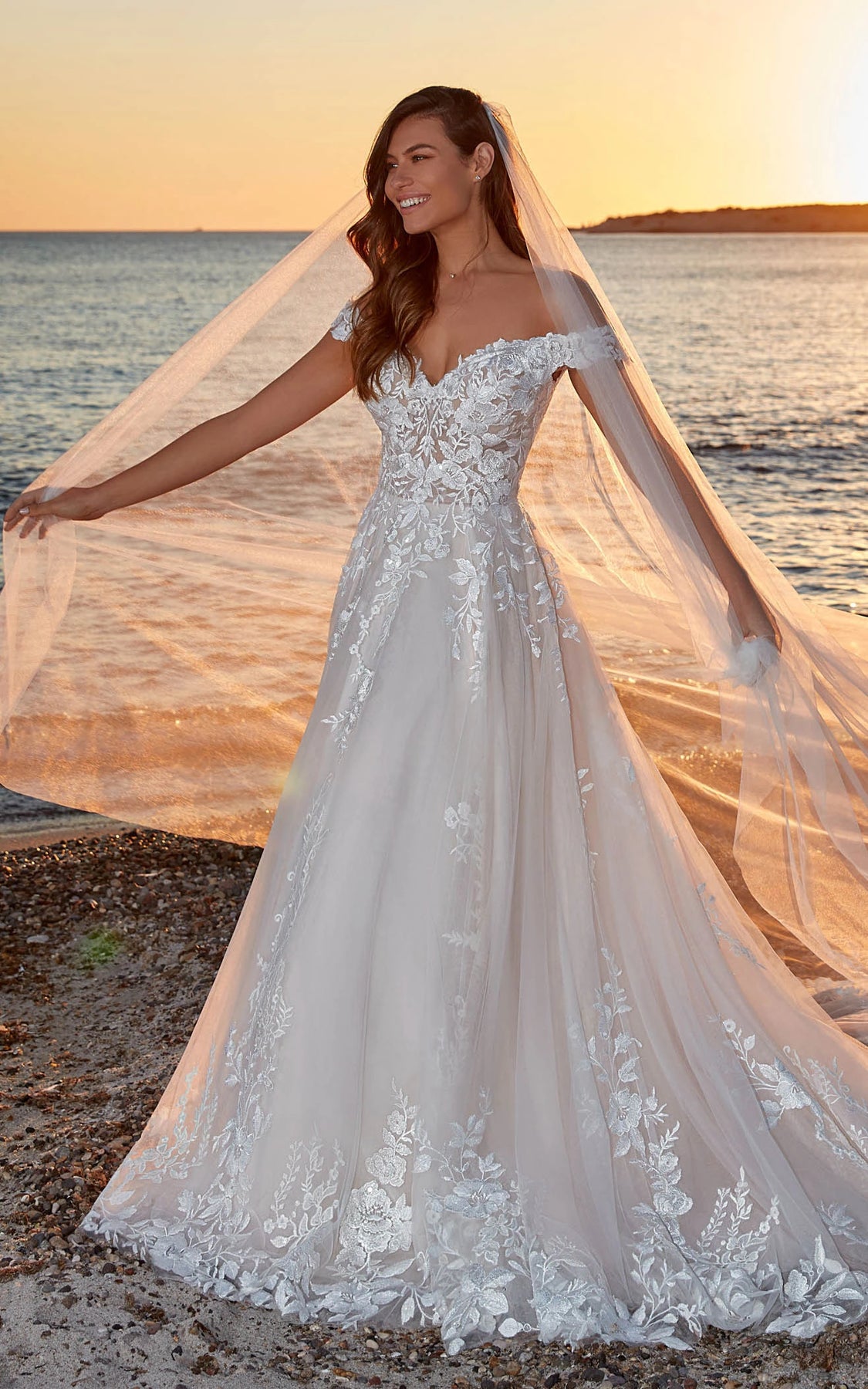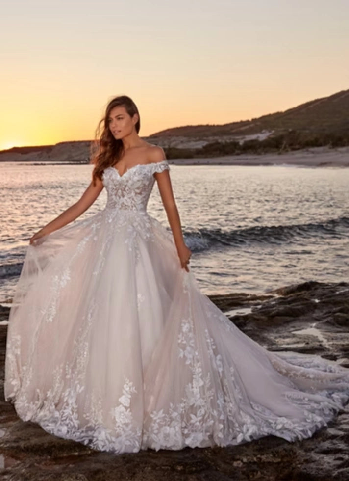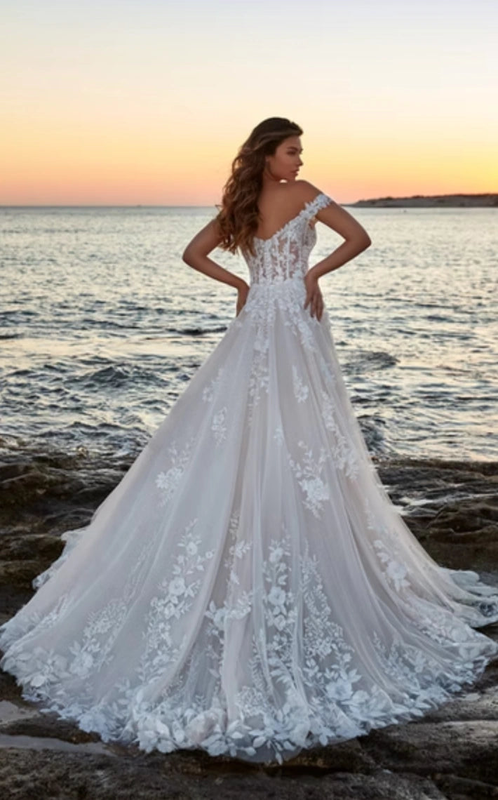 Eddy K. Adora DR2301 is a beautiful tulle A-line wedding dress featuring sparkly lace appliqués! This gown comes to us in great condition from a designer boutique. There is a missing button on the back. Eddy K. Adora DR2301 is Ivory/Champagne/Dust/Skin in color and a size 8.