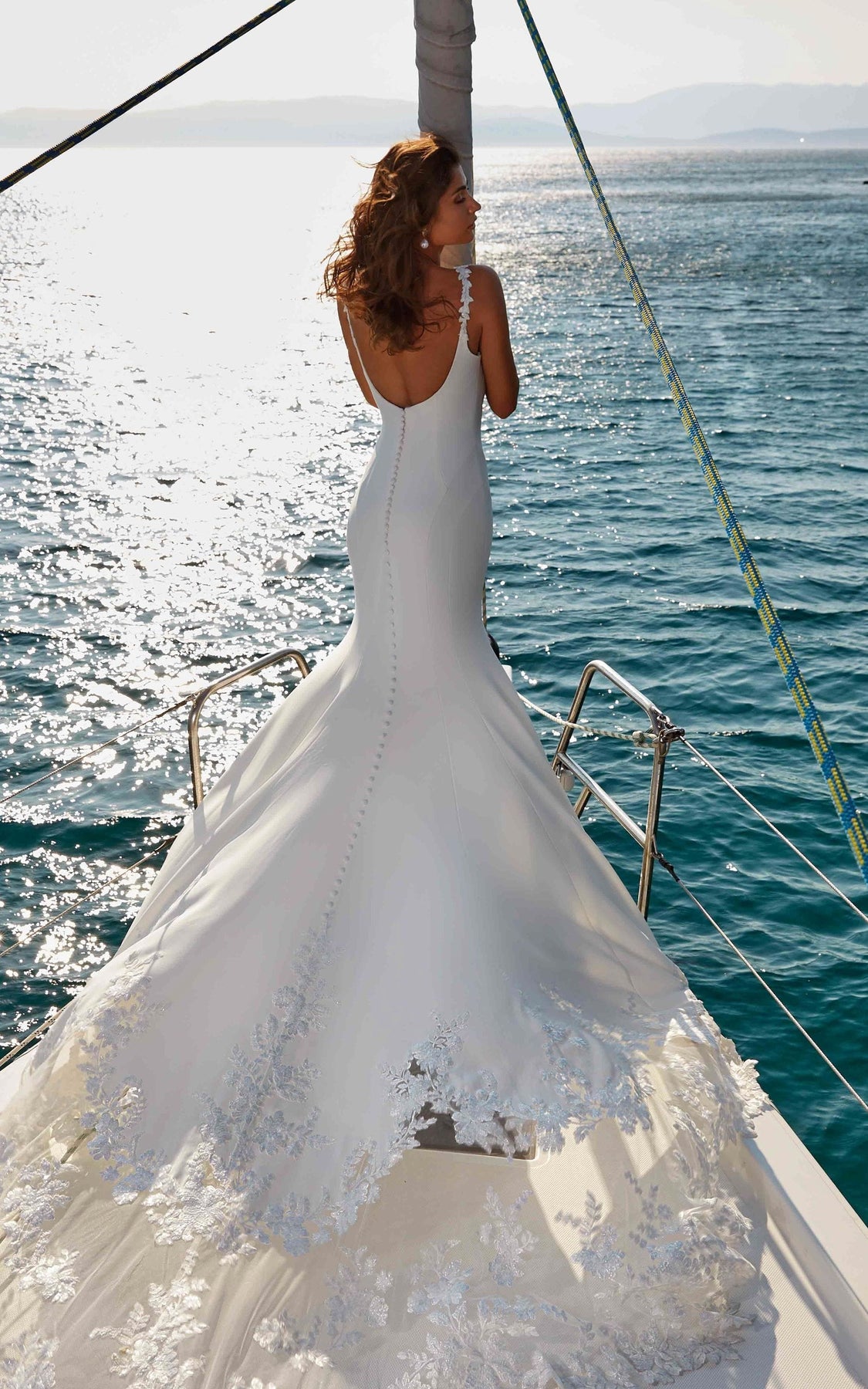 Eddy K. Nikita is a lovely crepe sheath wedding dress! The picture-worthy train has cascading lace details. This gown comes to us in great condition from a designer boutique. Eddy K. Nikita is Ivory in color and a size 8.