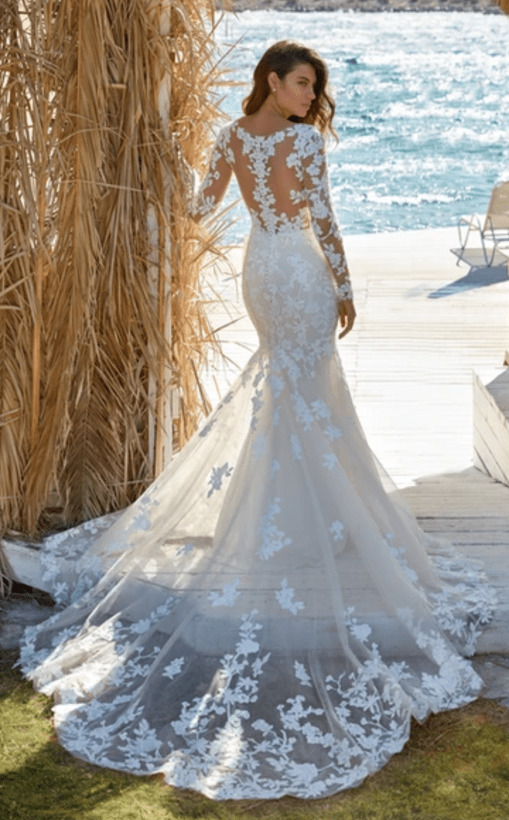 Eddy K. Priyanka DR2314 is an elegant lace fit and flare wedding dress! This silhouette has a V neckline, long sleeves, + sheer train. This gown comes to us in great condition from a designer boutique. Eddy K. Priyanka DR2314 is Champagne/Ivory in color and a size 12.