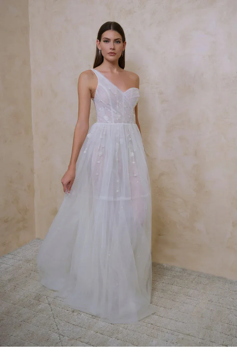 Enaura Leonie is a dreamy tulle A-line wedding dress featuring a one-shoulder neckline with subtle floral accents! This gown comes to us in great condition from a designer boutique. Enaura Leonie is Ivory in color and a size 12.