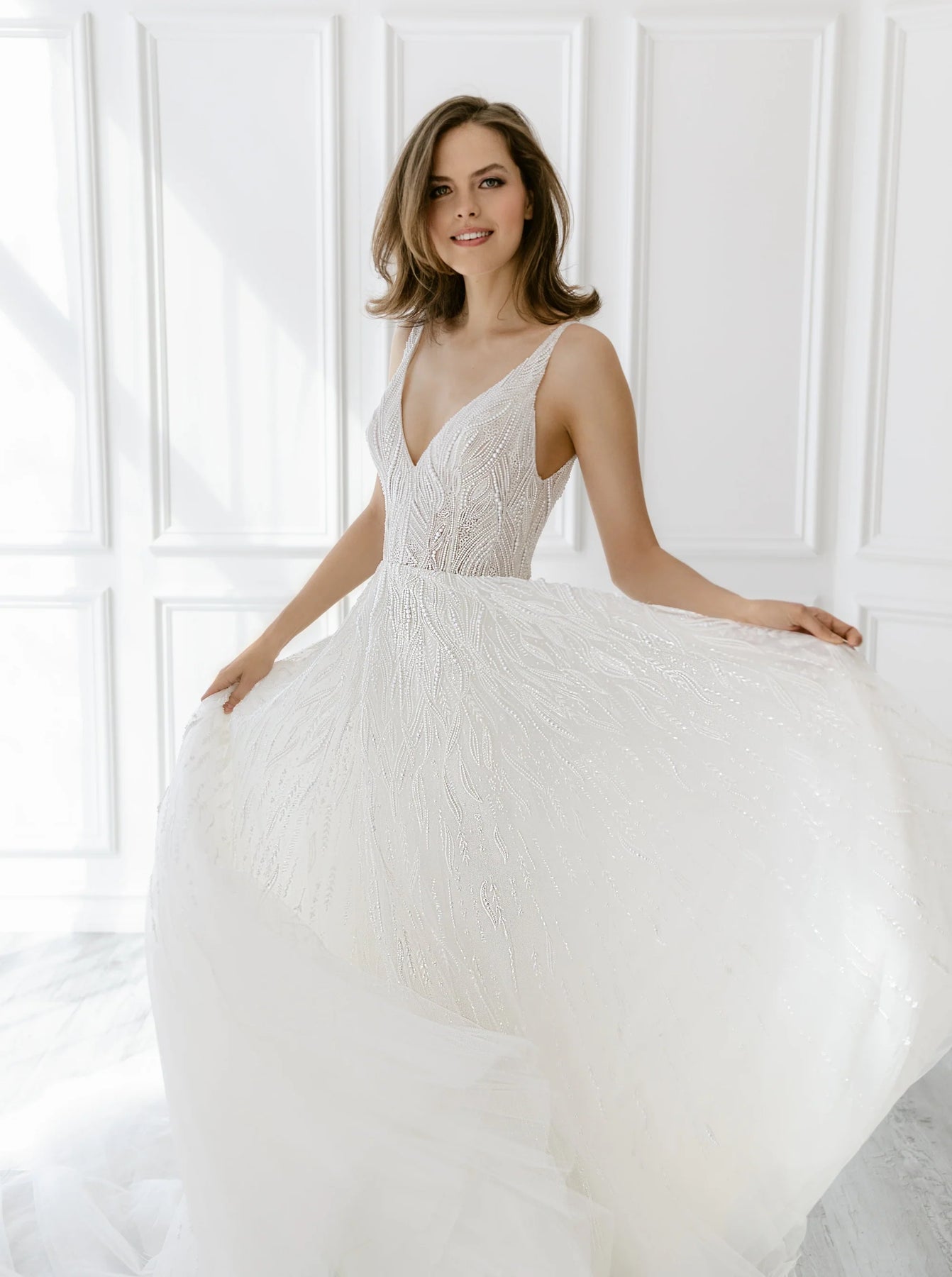 Enaura Margo is a pretty tulle A-line wedding dress featuring cascading beading! This gown comes to us in good condition from a designer boutique. The straps need cleaned, + there are loose/missing beads. Enaura Margo is Ivory in color and a size 14.