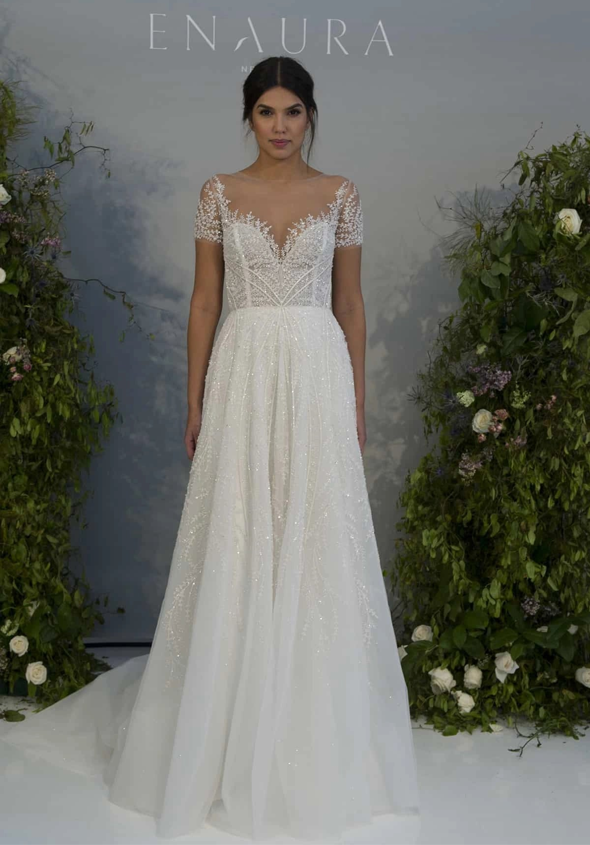 Enaura Serena is a sparkly beaded embroidered A-line wedding dress featuring cap sleeves + an illusion neckline! This gown comes to us in good condition from a designer boutique. There are spots on the underskirt. Enaura Serena is Blush/Ivory/Nude in color and a size 12.