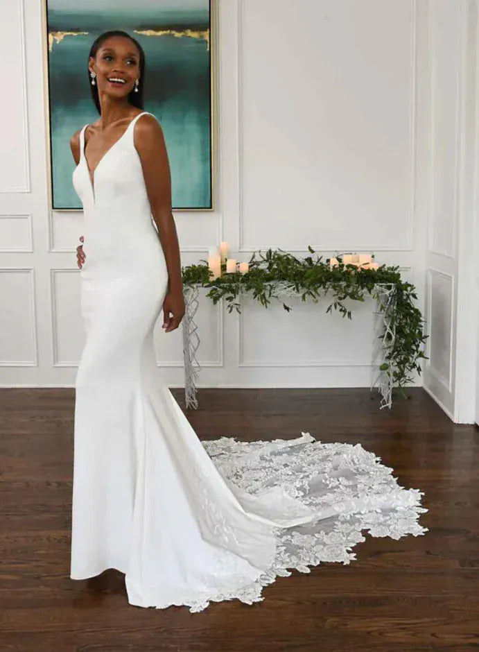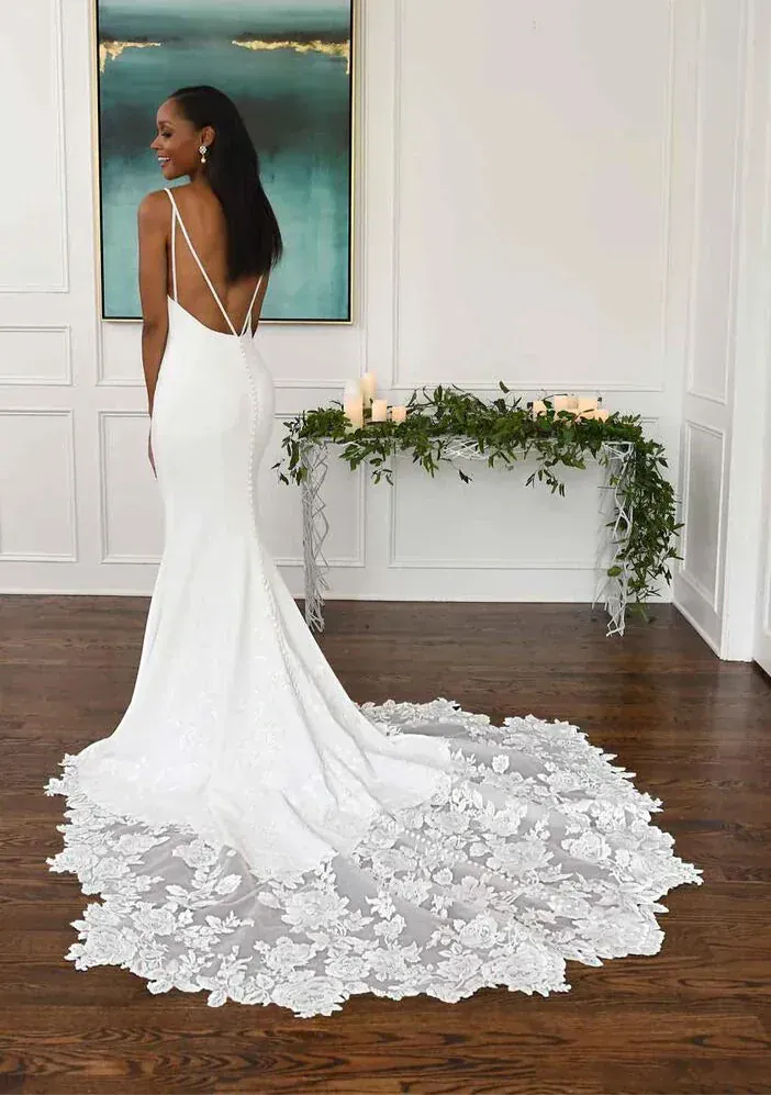 Essense of Australia D3112 is a modern crepe sheath wedding dress featuring a detailed lace train! This gown comes to us in great condition from a designer boutique. The hook/eye is missing. Essense of Australia D3112 is Ivory in color and a size 10.