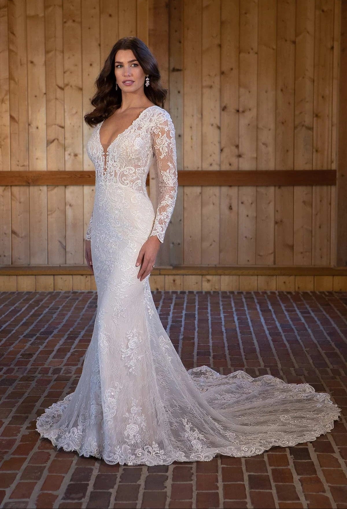 Essense of Australia D3363 is an eye-catching lace sheath wedding dress! Sheer long sleeves + subtle sequins elevate this silhouette. This gown comes to us in great condition from a designer boutique. There is a loose button on a sleeve. Essense of Australia D3363 is Ivory/Ivory/Porcelain in color and a size 16.