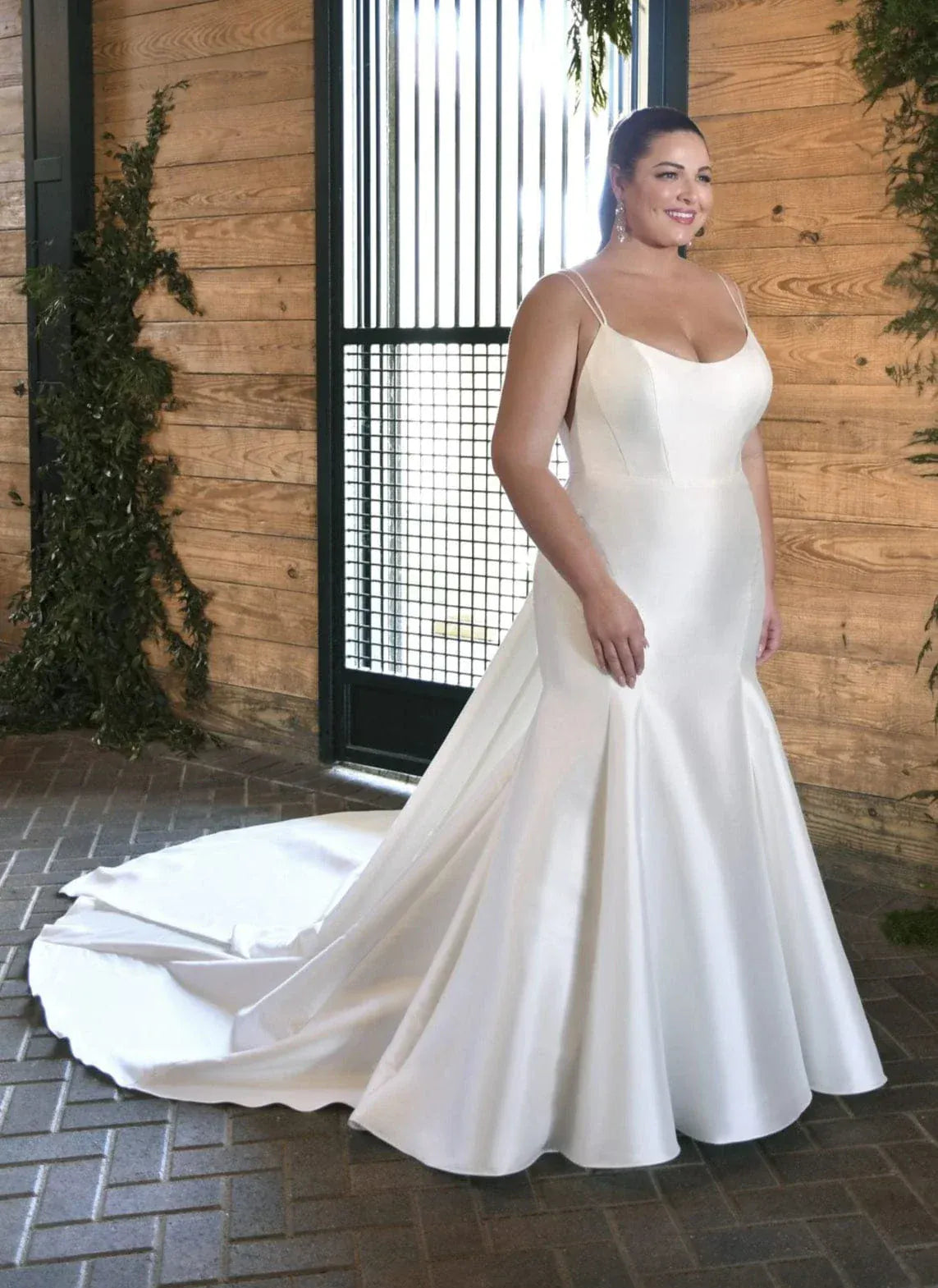 Essense of Australia D3404 is an elegant mikado fit and flare wedding dress with a scoop neckline + thin straps! This dress comes to us in fair condition from a designer boutique. Cleaning is needed for spots on the underarms, straps, + lining. Essense of Australia D3404 is Ivory in color and a size 20.