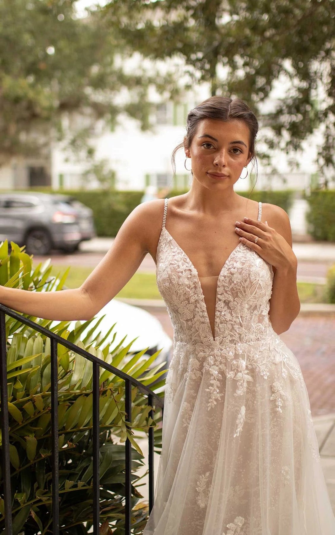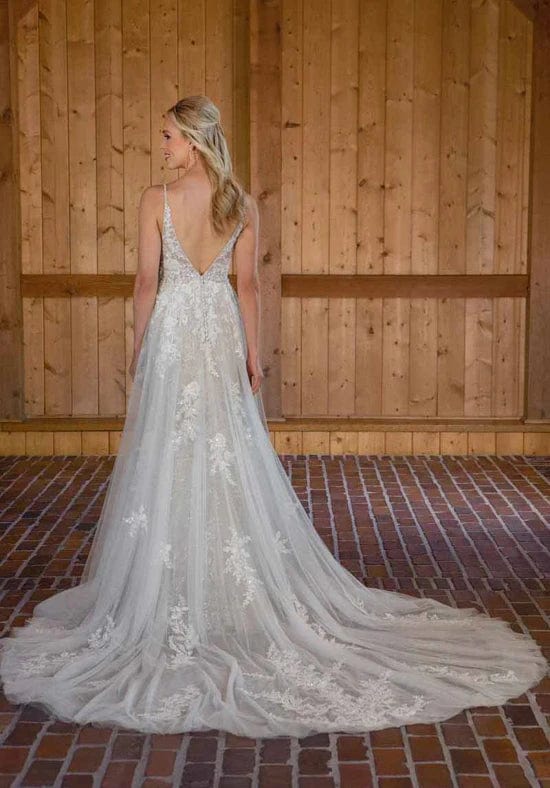 Essense of Australia D3707 is a charming tulle + lace A-line wedding dress featuring a plunging V neckline + dainty straps, with a sheer train! This gown comes to us in great condition from a designer boutique. Essense of Australia D3707 is Ivory/Rum/Porcelain in color and a size 10.