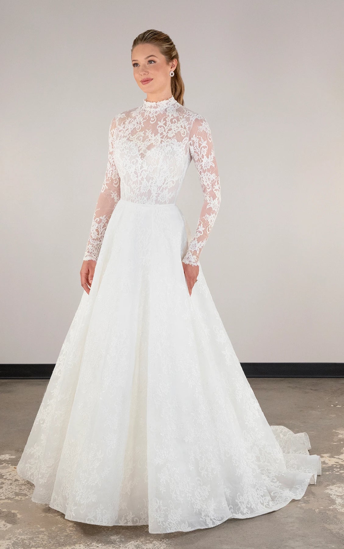 Essense of Australia D4028 is a romantic lace ball gown featuring a high neckline + long sleeves! Please note, our gown is the lined version. This gown comes to us in good condition from a designer boutique. There are spots on the neckline. Essense of Australia D4028 is Ivory/Ivory in color and a size 14.