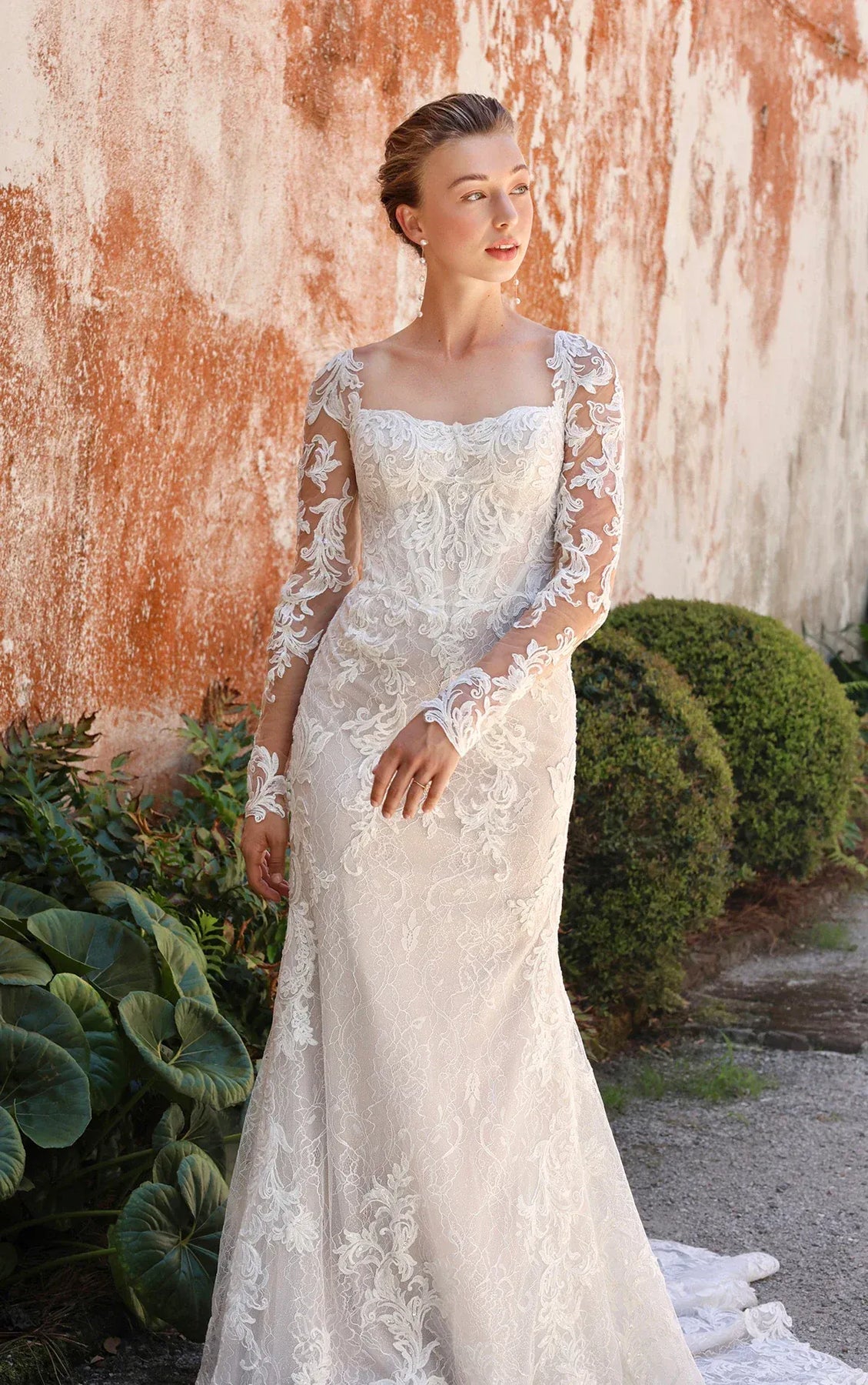 Essense of Australia D4172 is an alluring lace sheath wedding dress featuring a basque waist + long sleeves! Our gown is the lined version. This gown comes to us in great condition from a designer boutique. Essense of Australia D4172 is Ivory/Ivory/Porcelain in color and a size 14.