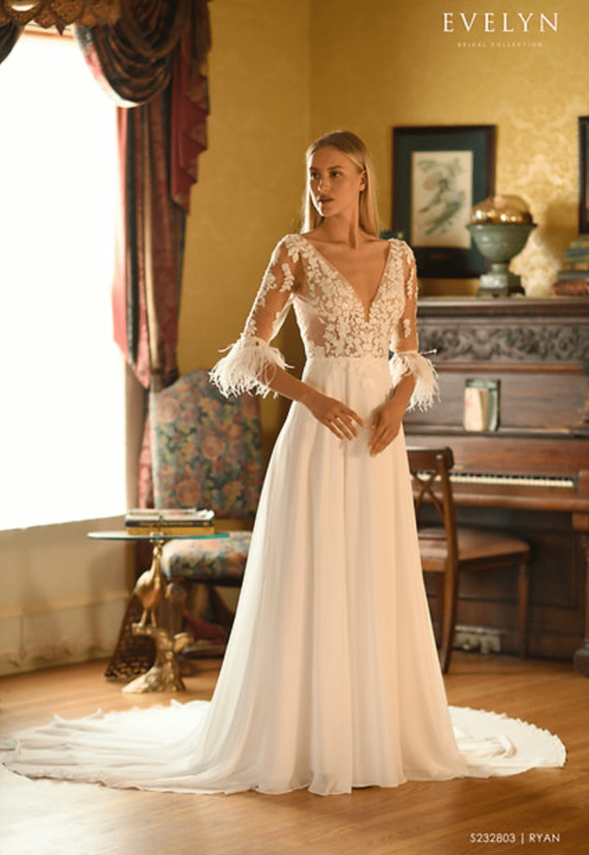Evelyn Bridal Ryan is a lovely chiffon A-line wedding dress! Floral lace adorns the bodice, with has three-quarter length sleeves. Please note, our gown does NOT have the feathers on the sleeve cuffs. This gown comes to us in fair condition from a designer boutique. There are loose threads/beads, spots on the skirt, + the zipper needs repaired. Evelyn Bridal Ryan is Ivory/Nude in color and a size 4.