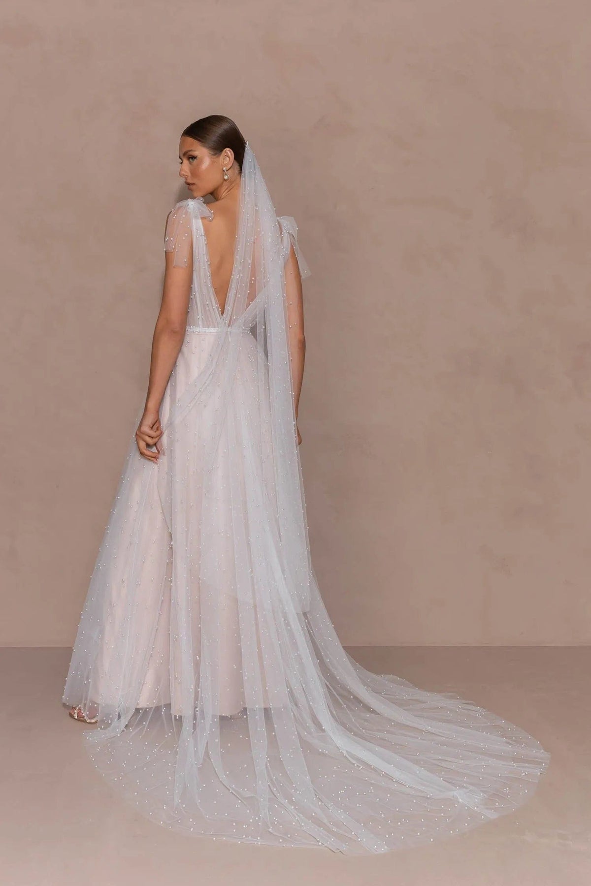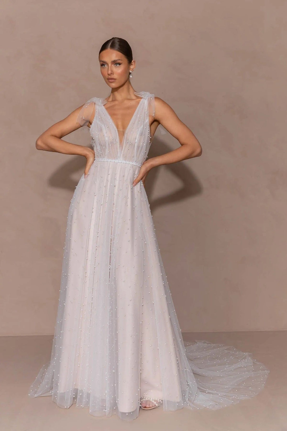 Evie Young Eve is a modern tulle A-line wedding dress covered in pearls! A belt at the waist lends a subtle pop of detail. This gown comes to us in great condition from a designer boutique. Evie Young Eve is Ivory in color and a size 8.
