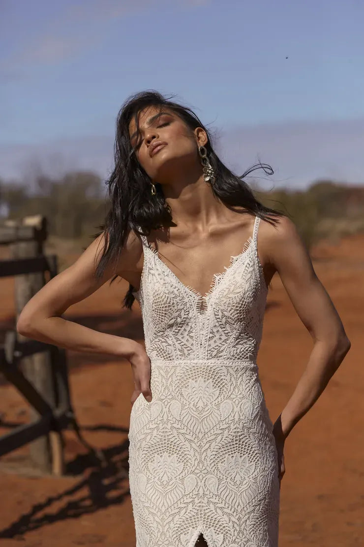Evie Young Rue is a beautiful lace fit and flare wedding dress featuring a slit in the skirt + detachable off-the-shoulder straps! This gown comes to us in great condition from a designer boutique. Evie Young Rue is Nude in color and a size 12.