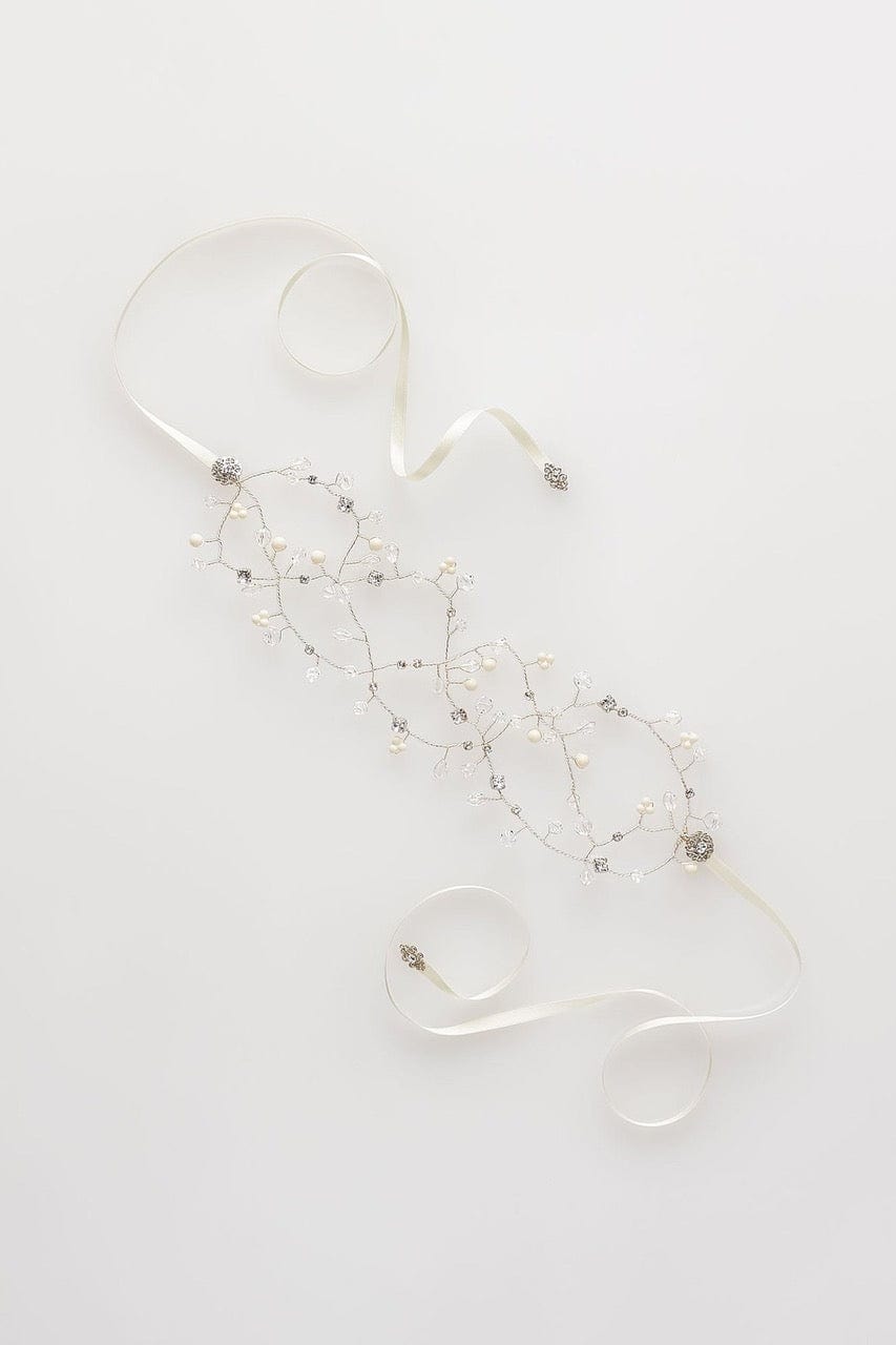 Sara Gabriel Freya Duet is composed of interwoven, flexible metal vines accented with hand-wired sprigs + crystals. Sara Gabriel's "duets" can be tied in your hair, over your forehead, or around your waist for endless styling options.