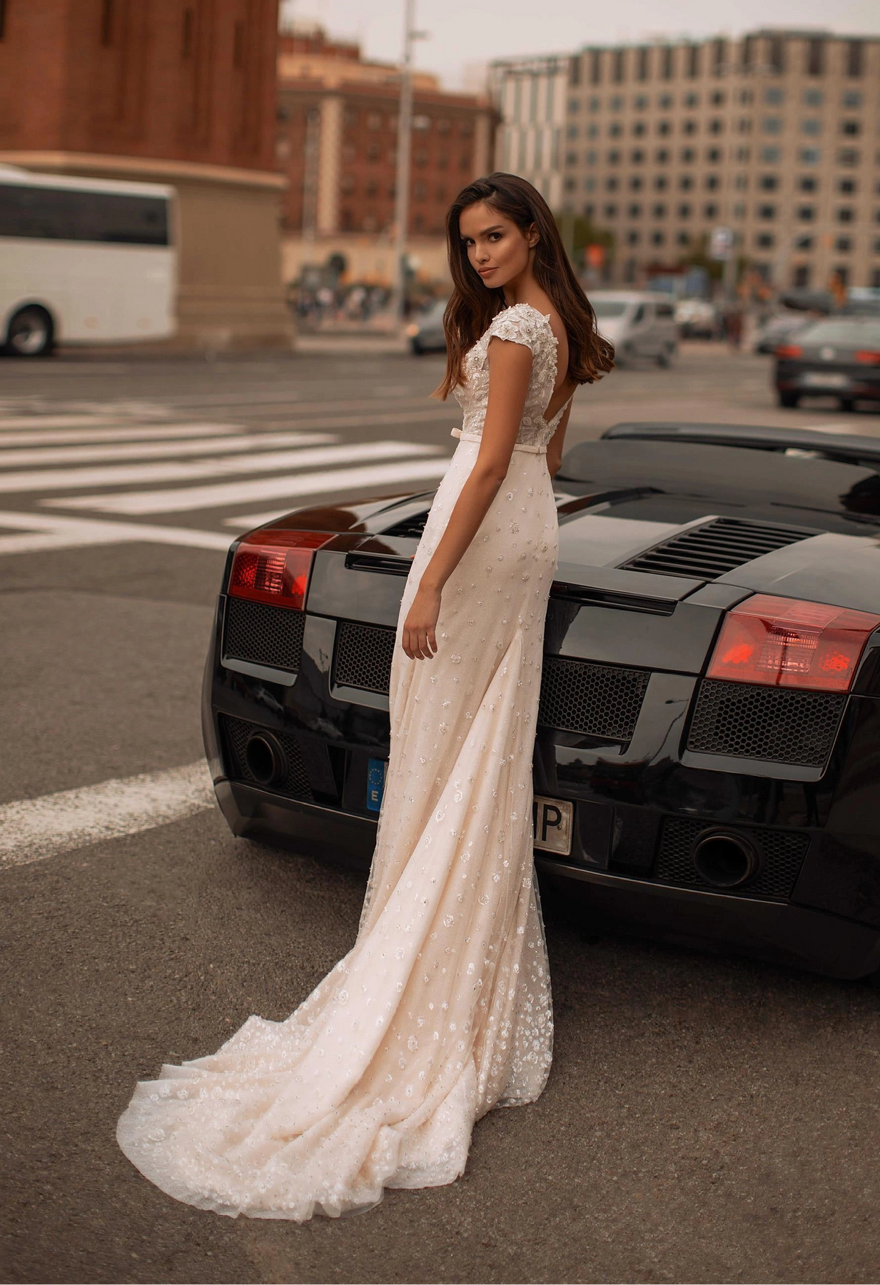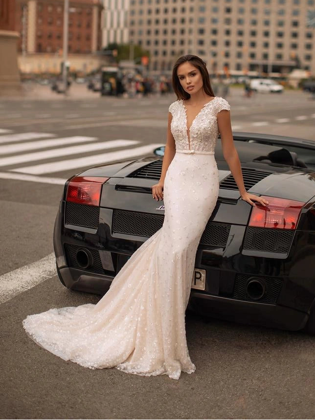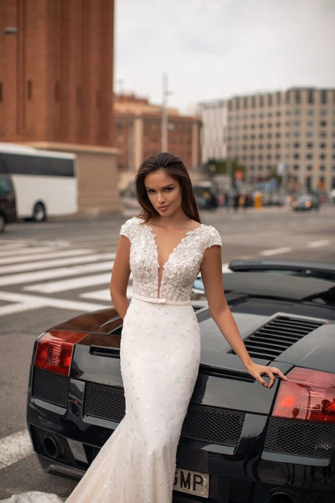 Giovanna Alessandro Amelia is a jaw-dropping beaded fit and flare wedding dress featuring a deep neckline, cap sleeves, + a bow belt! This gown comes to us in great condition from a designer boutique. Giovanna Alessandro Amelia is Blush in color and a European size 38, which fits like a US size 6.