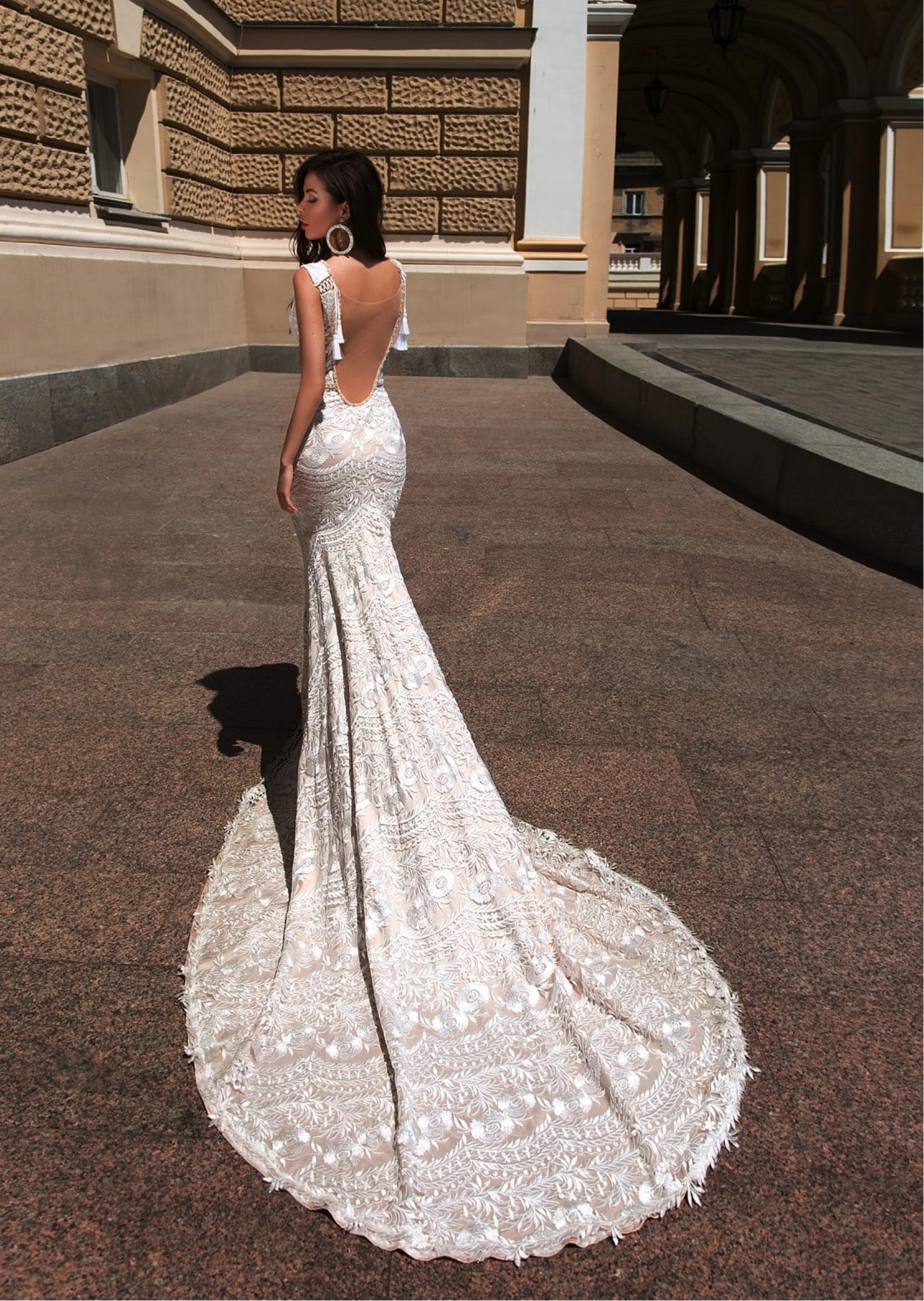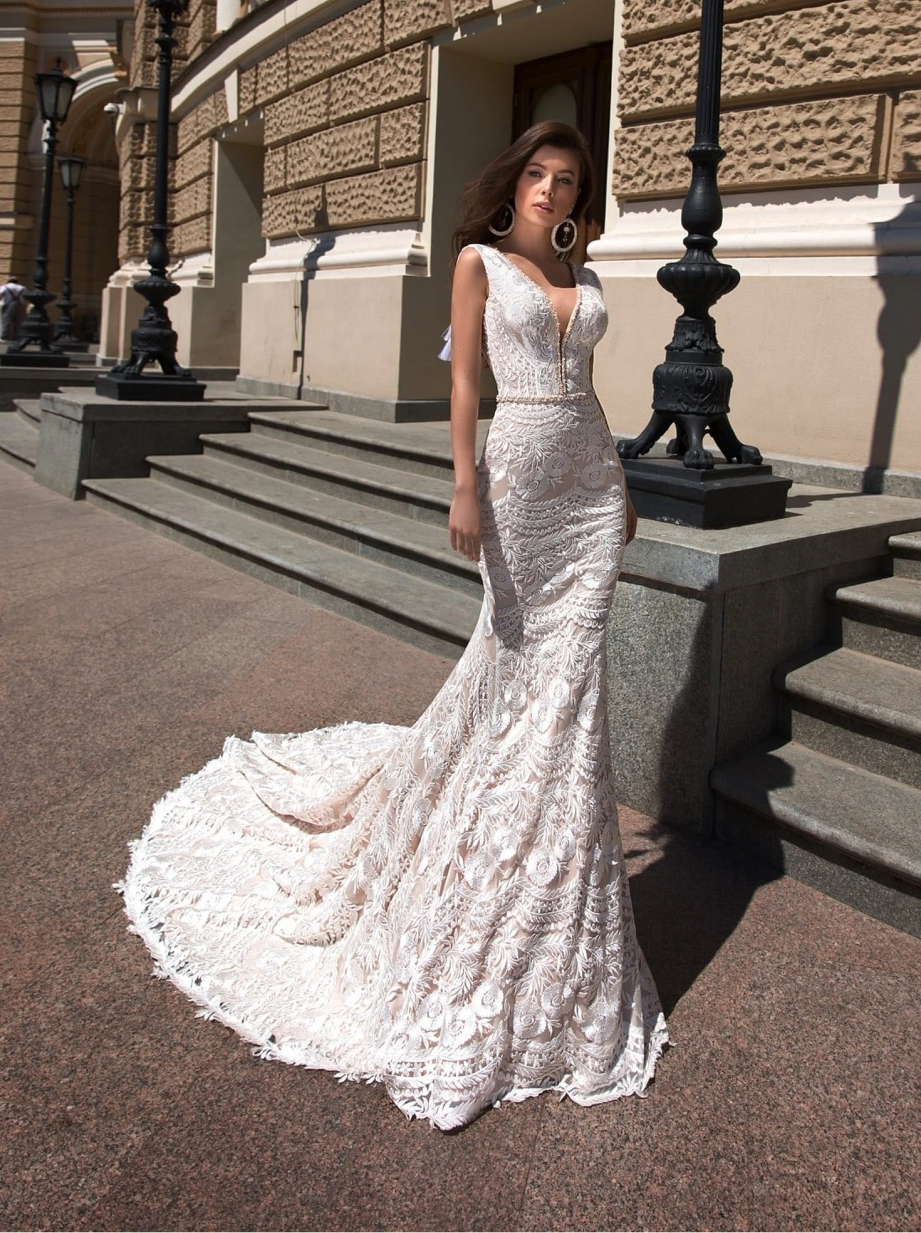 Ida Torez Starfish Jungle is a luxurious lace fit and flare wedding dress featuring a plunging neckline + romantic floral print! This gown comes to us in good condition from a designer boutique. There are loose threads. Ida Torez Starfish Jungle is Off White in color and a European size 42, which fits like a US size 10.