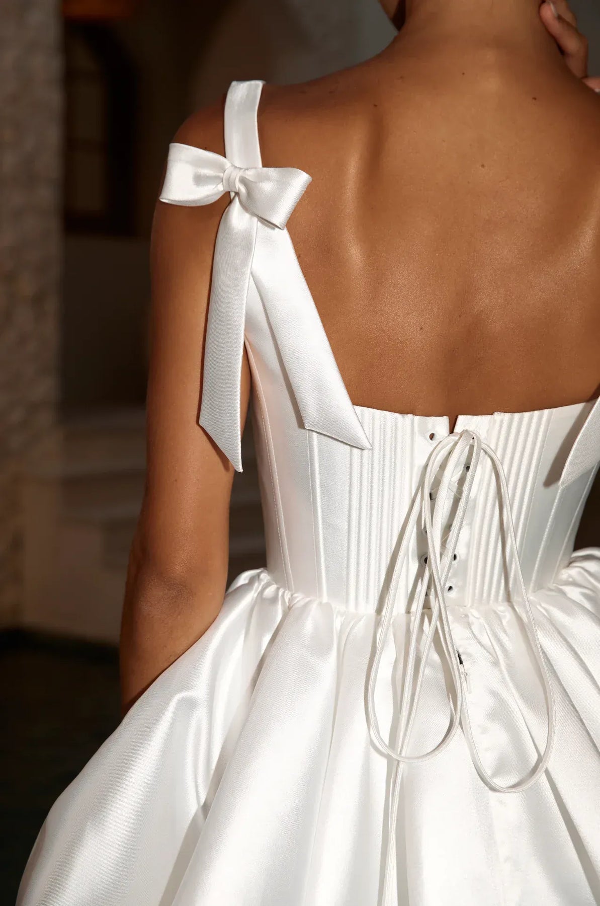 Jane Hill Bambi is a jaw-dropping mini dress with a bubble skirt + basque waist! This gown comes to us in good condition from a designer boutique. The bow hook/eye needs replaced, + the straps, corset tie, + lining need cleaned. Jane Hill Bambi is Ivory in color and an Australian size 14, which fits like a US size 10.