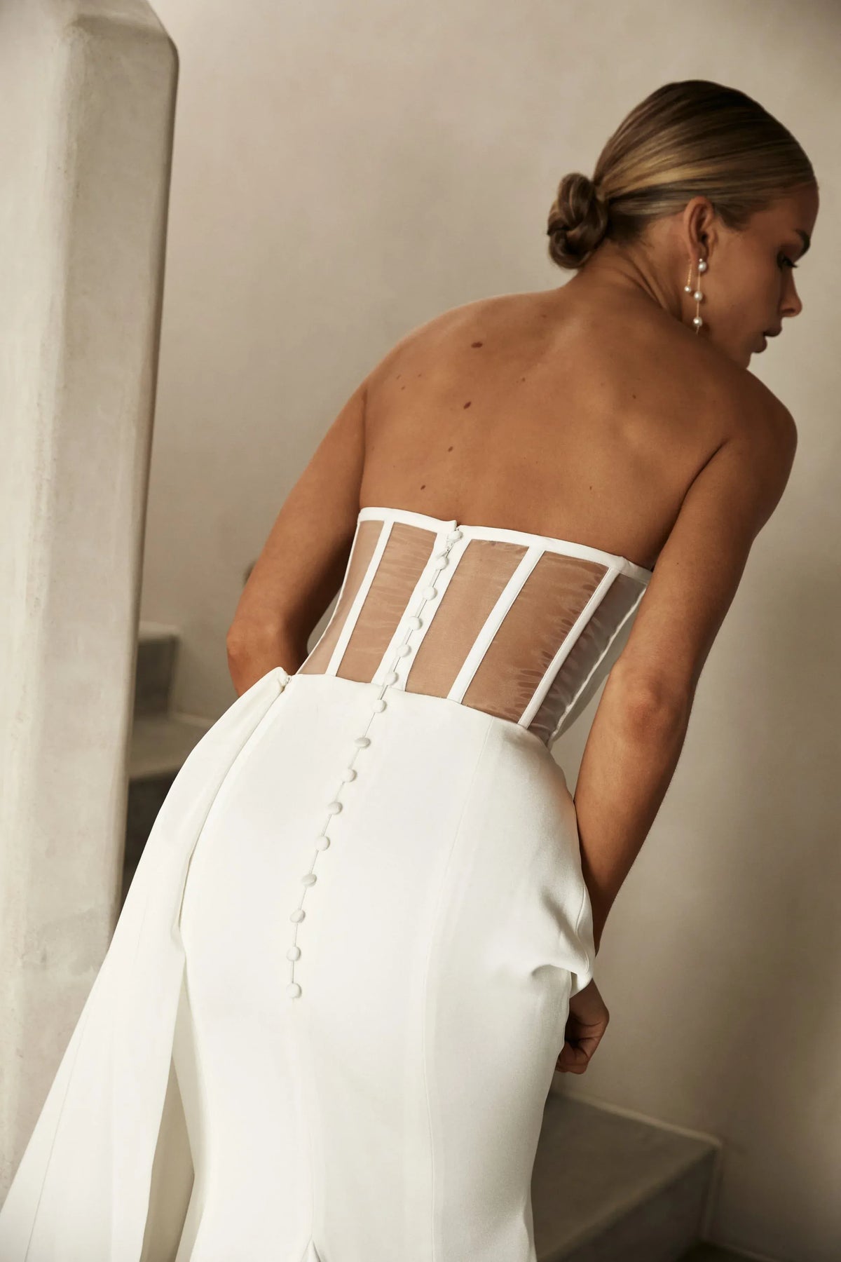 Jane Hill Ford is a modern crepe fit and flare wedding dress featuring a pearl-encrusted neckline + detachable side skirt! This gown comes to us in good condition from a designer boutique. There is minor wear on the bodice. Jane Hill Ford is Ivory in color and an Australian size 14, which fits like a US size 10.