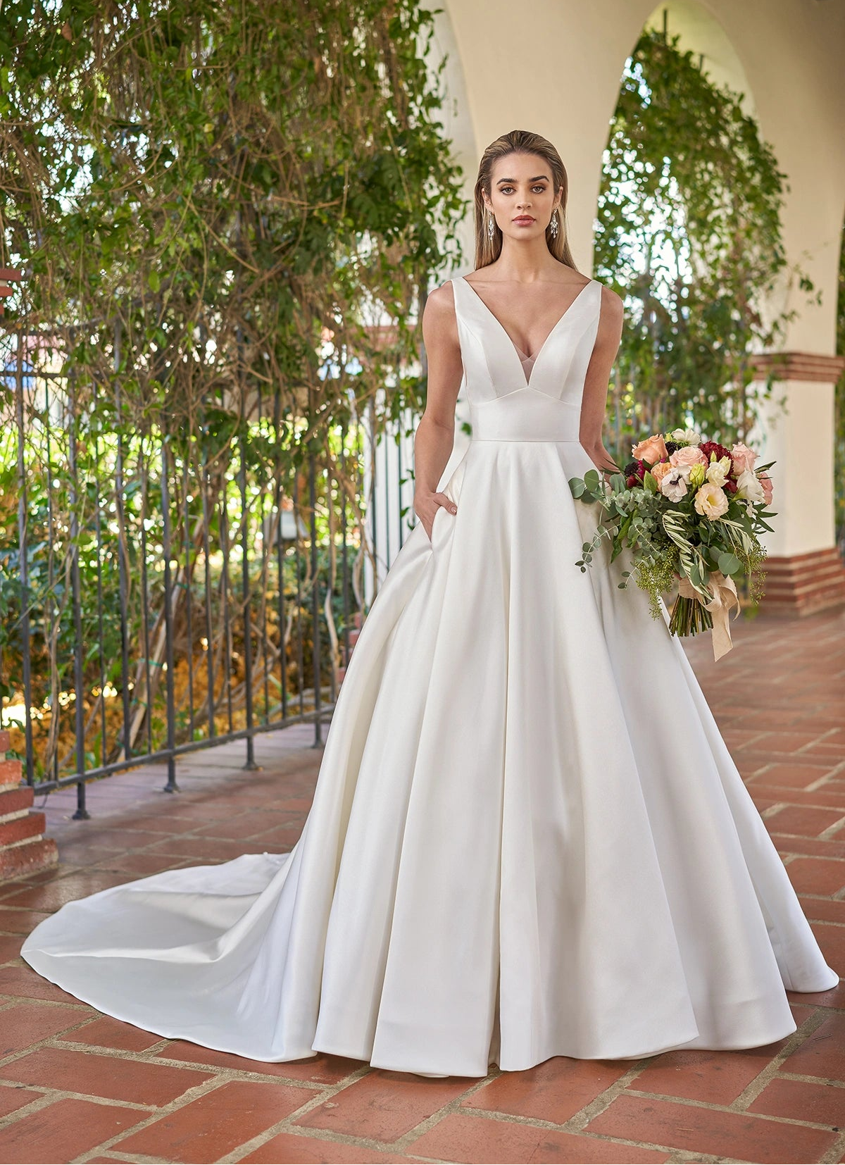 Jasmine Bridal Gigi T252065 is an elegant mikado A-line wedding dress with a cummerbund waist! This gown comes to us in great condition from a designer boutique. Jasmine Bridal Gigi T252065 is Ivory in color and a size 12.