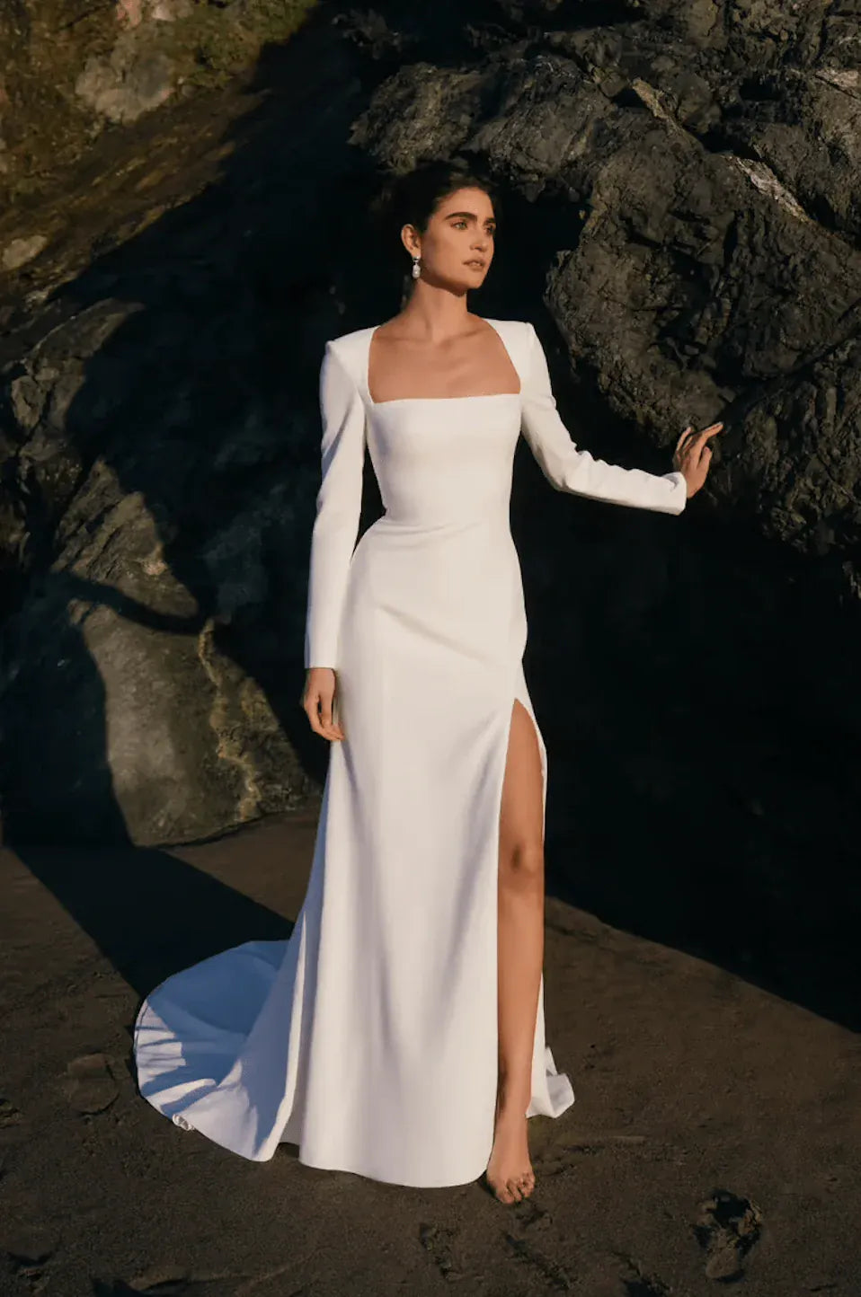 Jenny Yoo Bette is a striking crepe fit and flare wedding dress featuring a square neckline + long sleeves! This gown comes to us in great condition from a designer boutique. Jenny Yoo Bette is Antique White in color and a size 12.