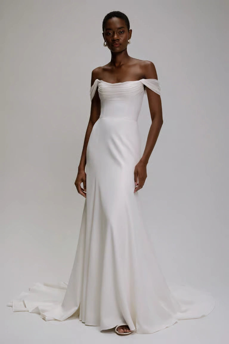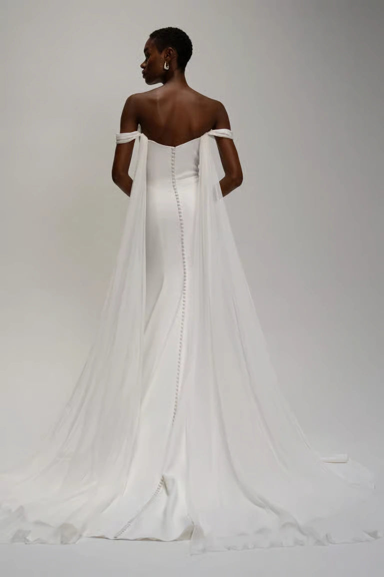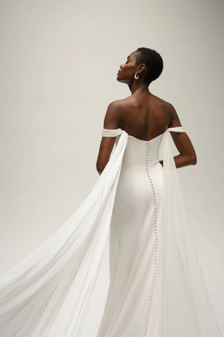 Jenny Yoo Francesca is an effortless crepe fit and flare wedding dress featuring a scoop neckline accented by tulle off-the-shoulder straps! This gown comes to us in great condition from a designer boutique. Jenny Yoo Francesca is Ivory in color and a size 10.