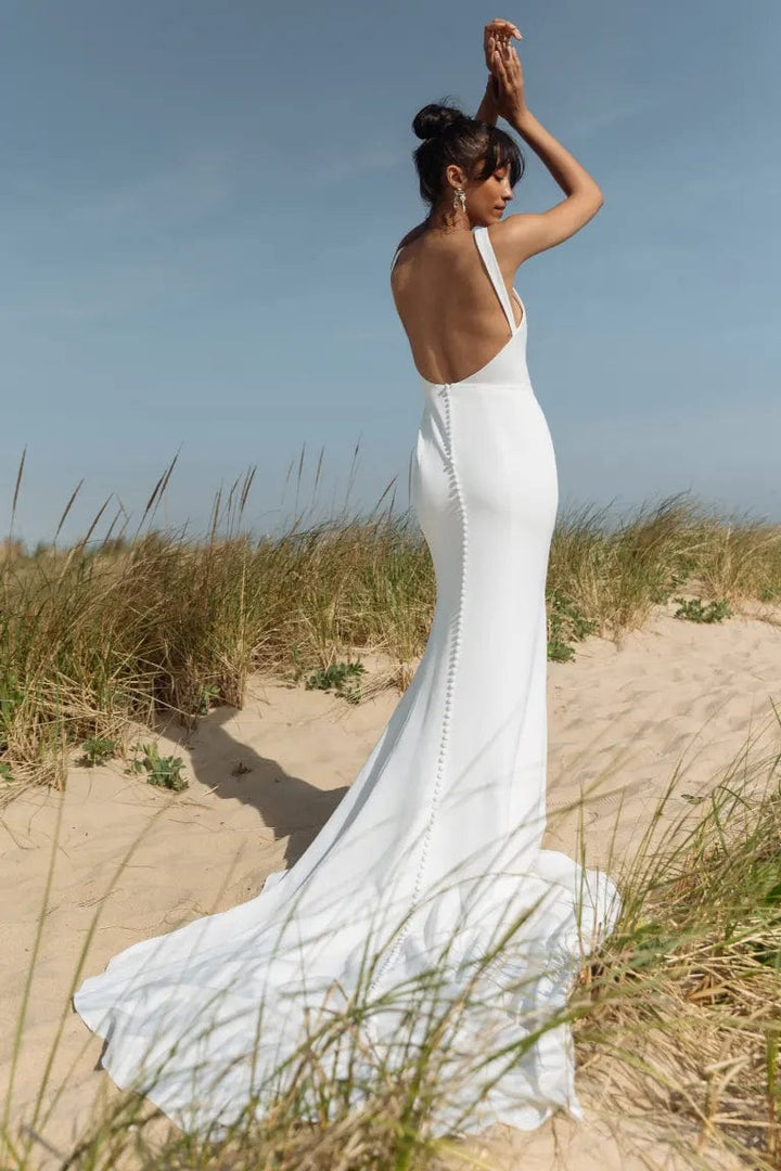 Jenny Yoo Samantha is a modern stretch crepe gown! This pretty little number features a sweetheart neckline, open back, + covered buttons down the back of the skirt + train.