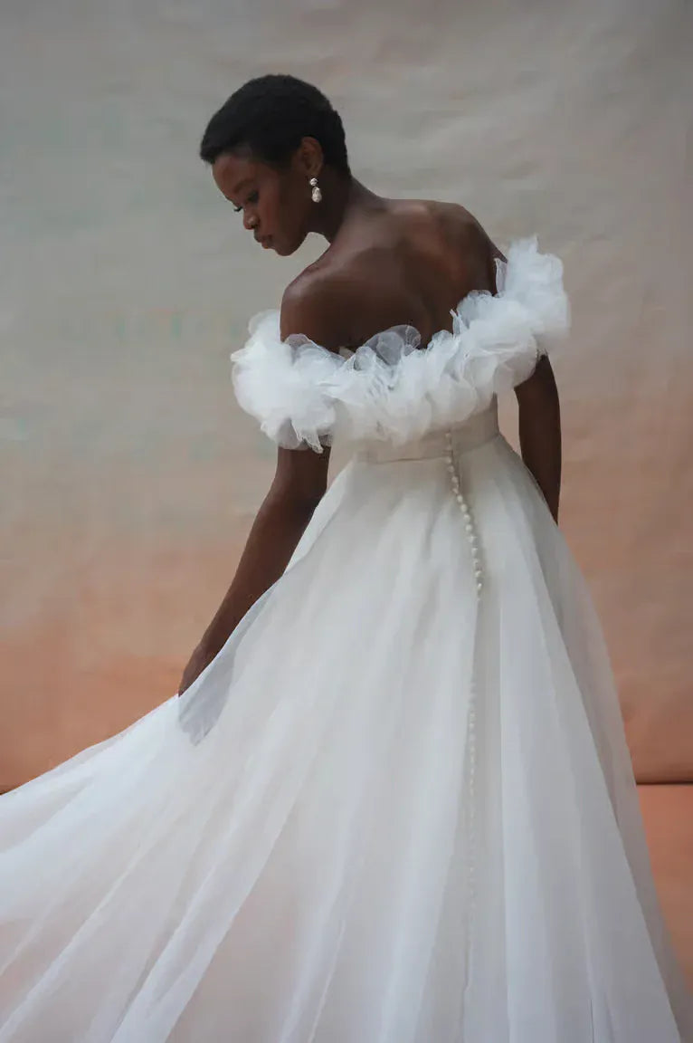 Your bridal gown size differs from your typical dress or pant size! We recommend ordering a sample 2-3 sizes larger than the size you wear in street clothing. For example, if you typically wear a size 12, your bridal size will most likely be a size 16 - 18, depending on the fit + designer. Please note, every designer runs different!