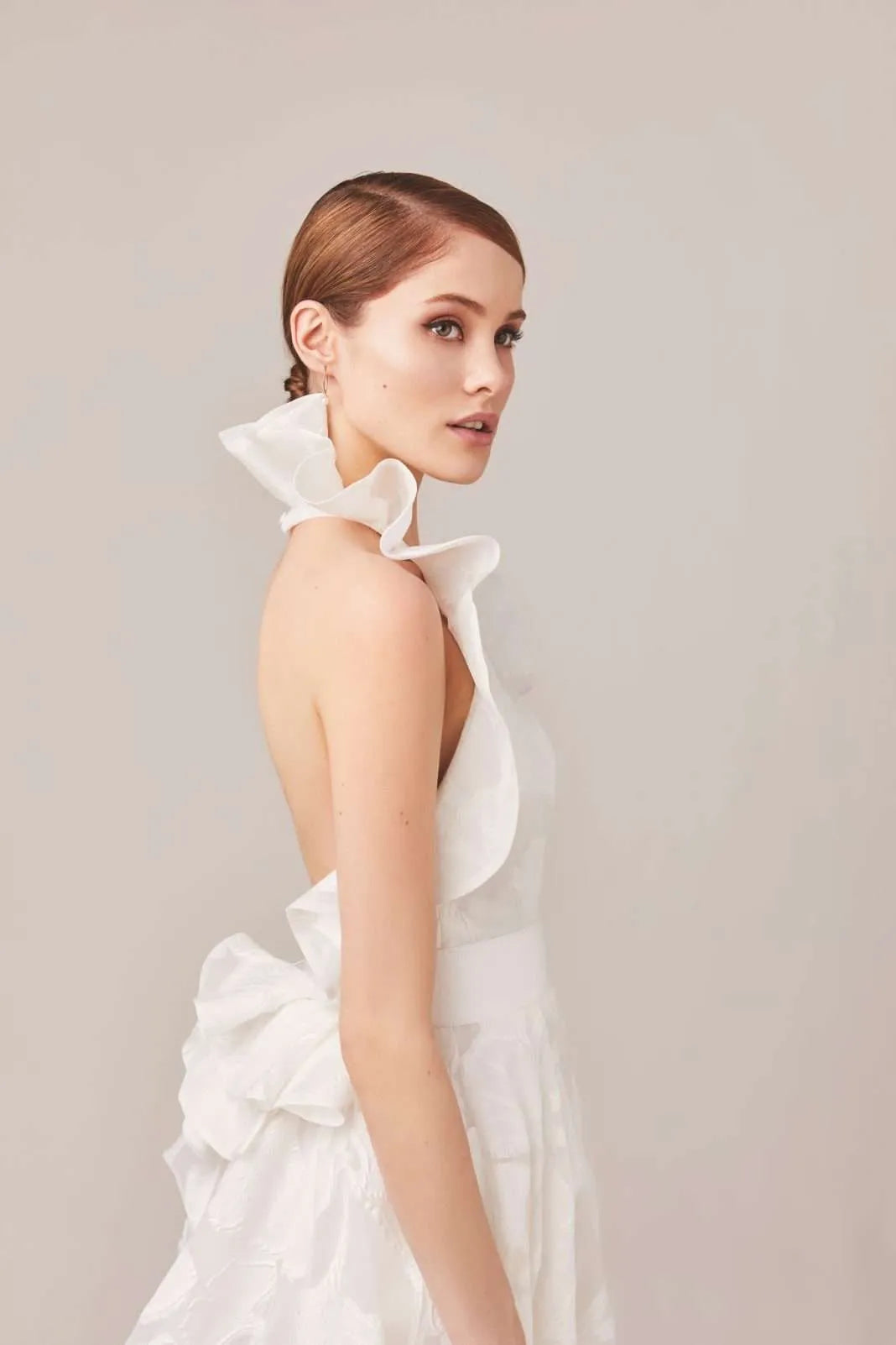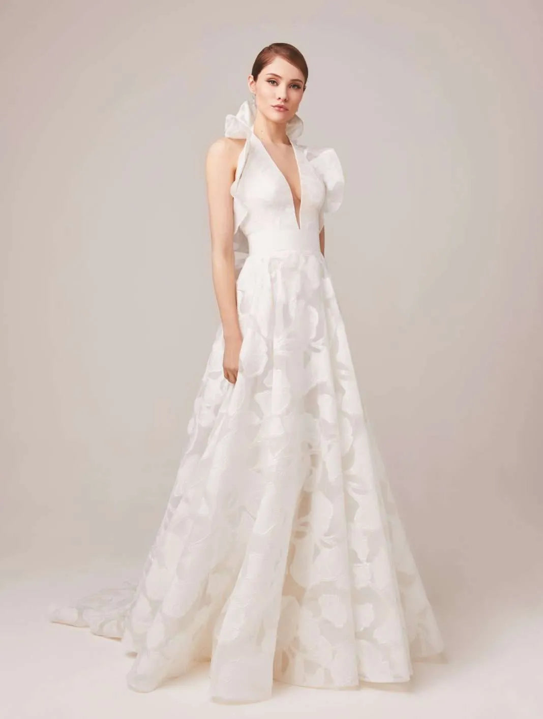 Jesus Peiro 173 is a dreamy coupe de fil A-line wedding dress featuring a floral pattern + halter neckline with an oversized ruffle! This gown comes to us in good condition from a designer boutique. There is boutique dust on the hem. Jesus Peiro 173 is Ivory in color and a size 10.