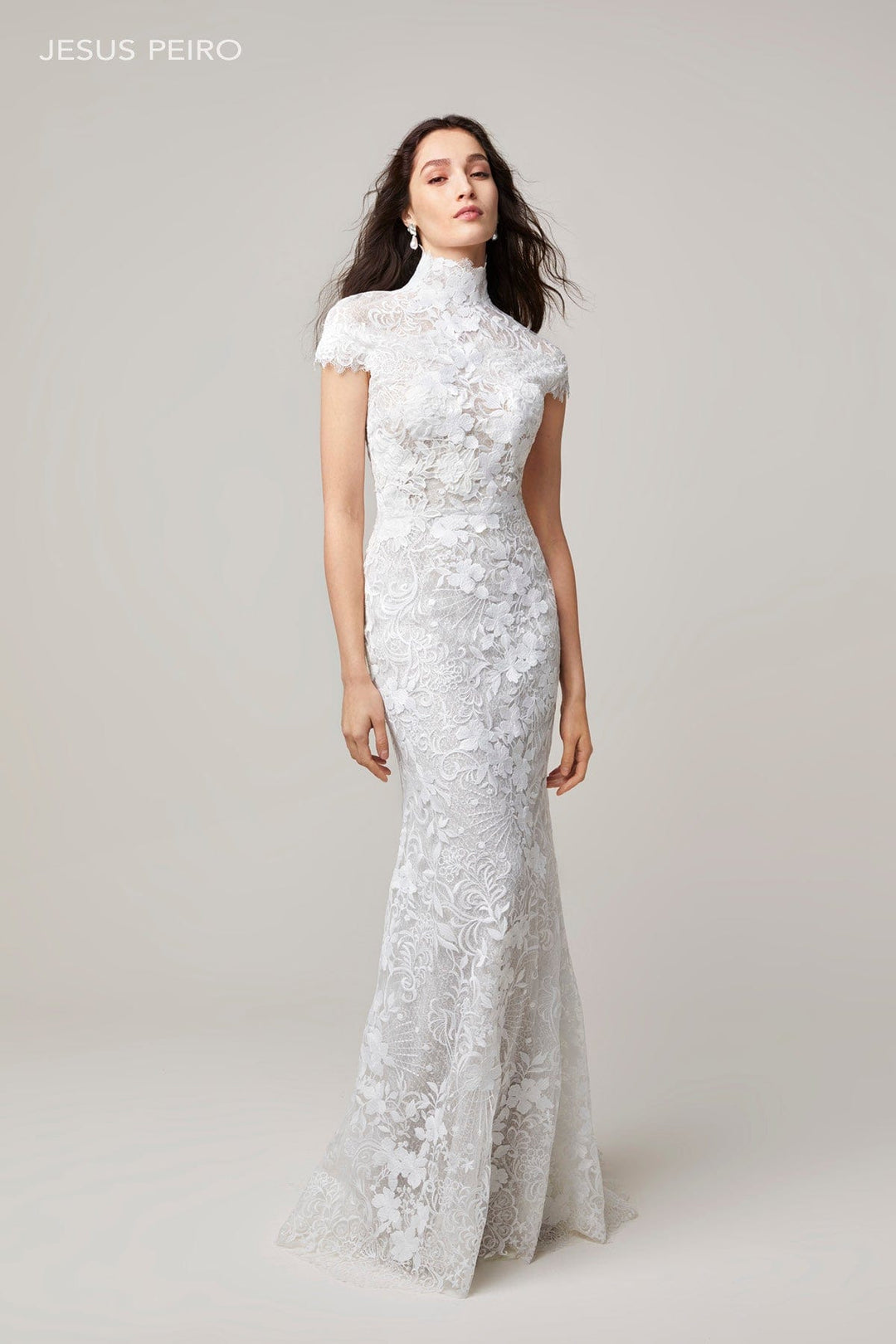 Jesus Peiro 2219 is a modern gown of jaw-dropping embroidered floral lace! This chic look has an off the shoulder neckline beneath a high-neck cap sleeve topper, + a simple short train. This gown comes to us in great condition from a designer boutique. Jesus Peiro 2219 is Ivory/Nude in color and a size 10.