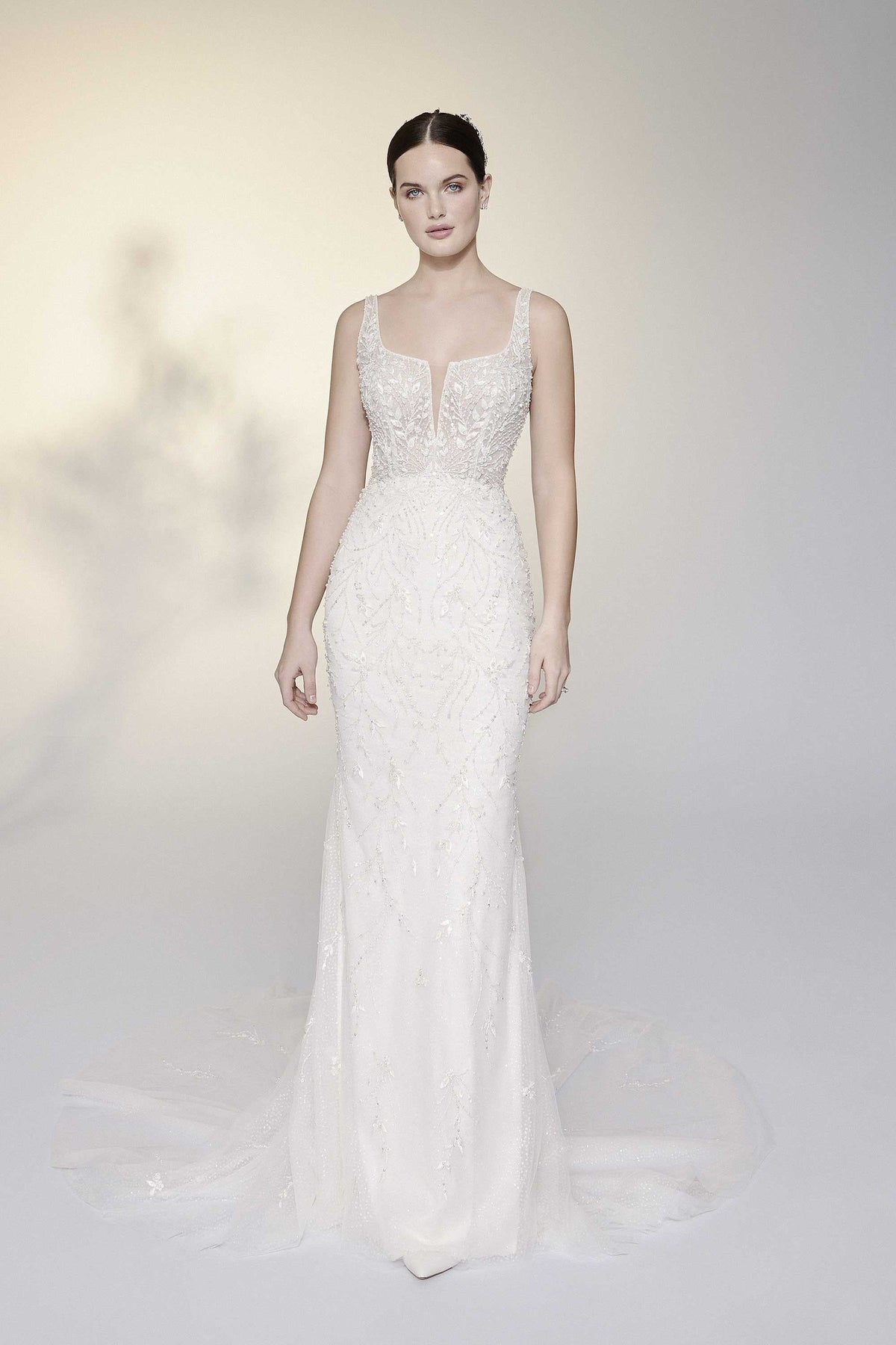 Signature by Justin Alexander Evelyn 99200 is a dazzling fit and flare wedding dress accented with beaded floral embroidery! The bodice features a modern notched square neckline + low, open back. This gown comes to us in great condition from a designer boutique. A cup needs retacked. Signature by Justin Alexander Evelyn 99200 is Ivory/Ivory/Silver/Nude in color and a size 14.