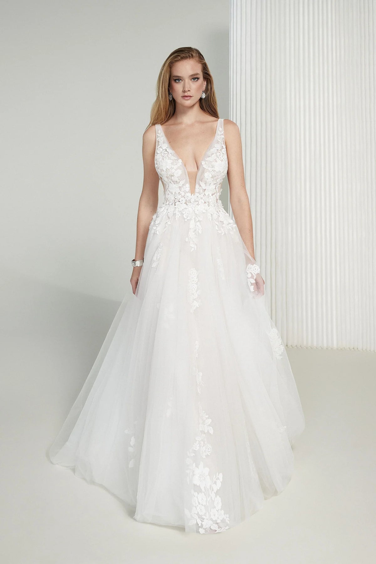 Signature by Justin Alexander Katharine 99213 is a regal tulle A-line wedding dress featuring scattered lace appliqués throughout! This gown comes to us in good condition from a designer boutique. The hook/eye needs replaced, + there is a faint spot on the lining. Signature by Justin Alexander Katharine 99213 is Sand/Ivory/Nude in color and a size 6.