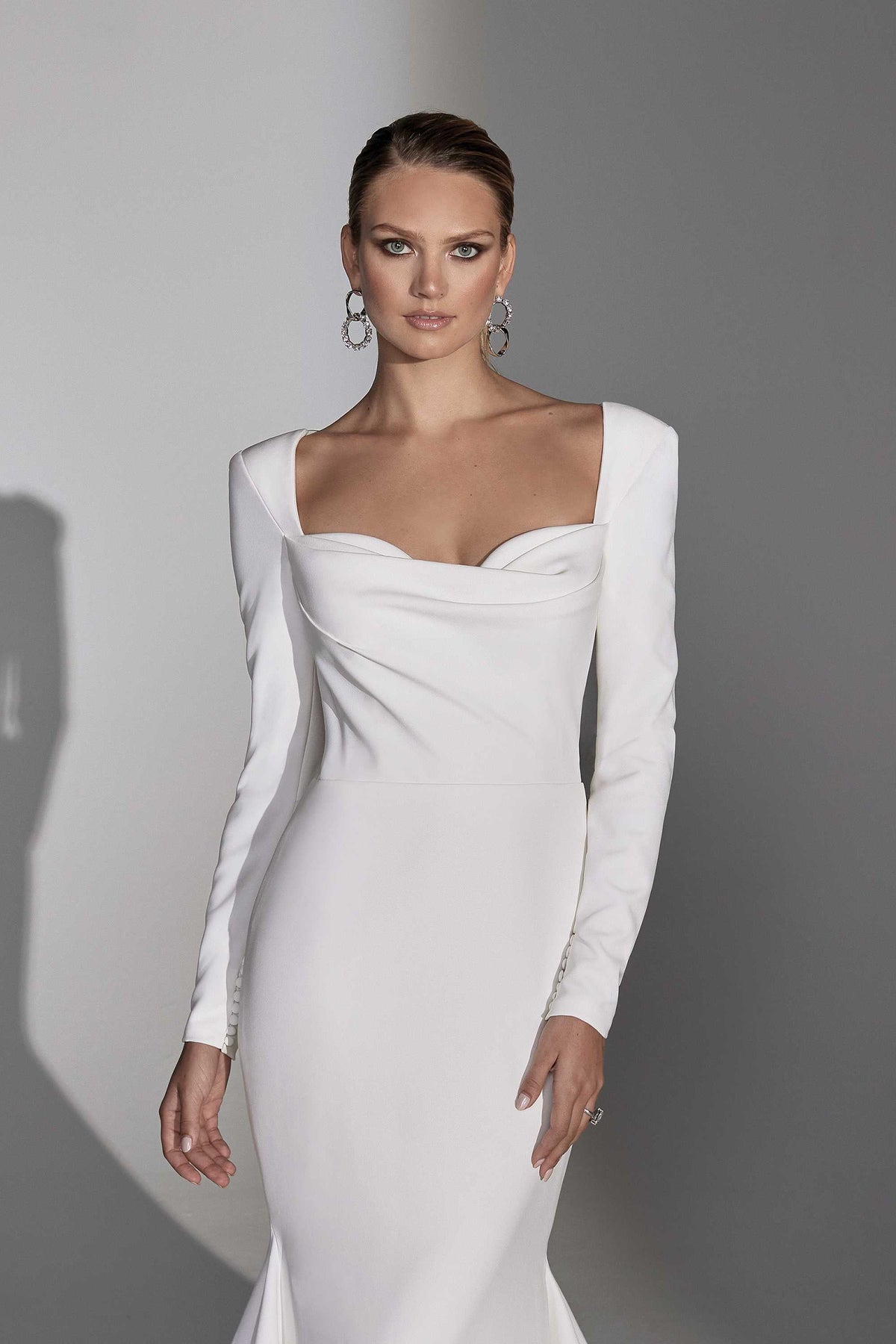 Signature by Justin Alexander Norma 99244 is a glamorous crepe wedding dress! This striking silhouette features a draped sweetheart neckline framed by long sleeves. This gown comes to us in good condition from a designer boutique. There is a broken button loop, small holes in the back illusion, + spots on the hem. Signature by Justin Alexander Norma 99244 is Ivory in color and a size 10.