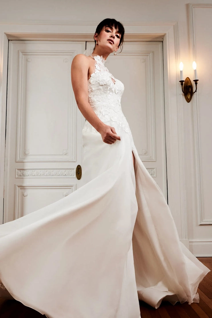 Kelly Faetanini Kenna is a stunning organza A-line wedding dress featuring a detachable halter neckline! This gown comes to us in great condition from a designer boutique. Kelly Faetanini Kenna is Ivory in color and a size 12.