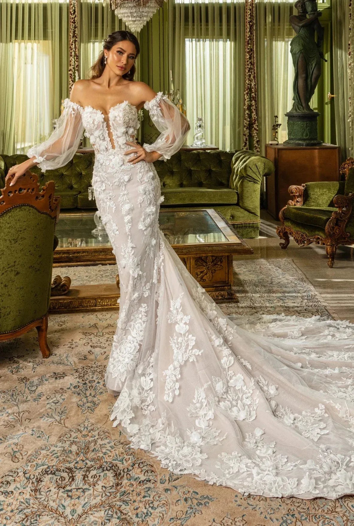 Kitty Chen Freya is a romantic lace fit and flare wedding dress featuring detached sheer long sleeves! This gown comes to us in great condition from a designer boutique. Kitty Chen Freya is Ivory in color and a size 12.