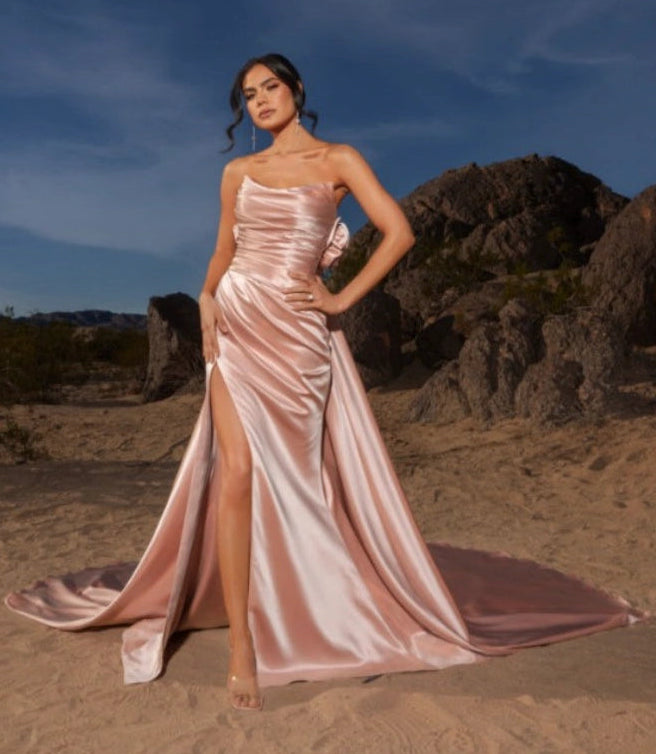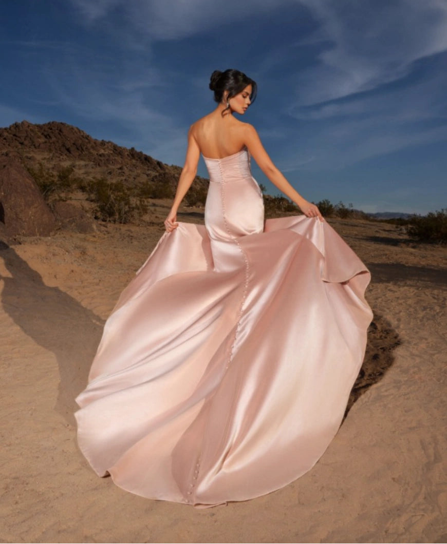 Kitty Chen Maureen is a stunning satin fit and flare wedding dress featuring rose-accented sleeves + a detachable train! This gown comes to us in good condition from a designer boutique. There is a spot on the underskirt. Kitty Chen Maureen + Train is Dusty Rose in color and a size 12.