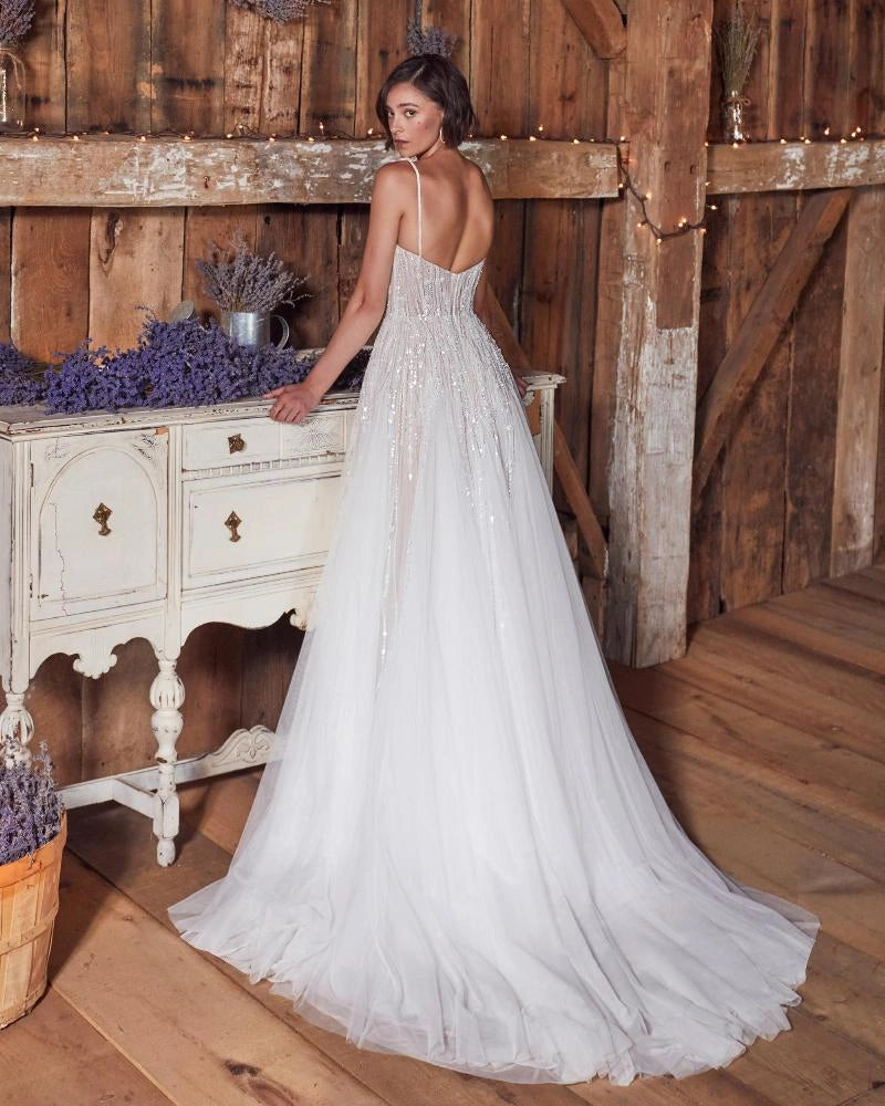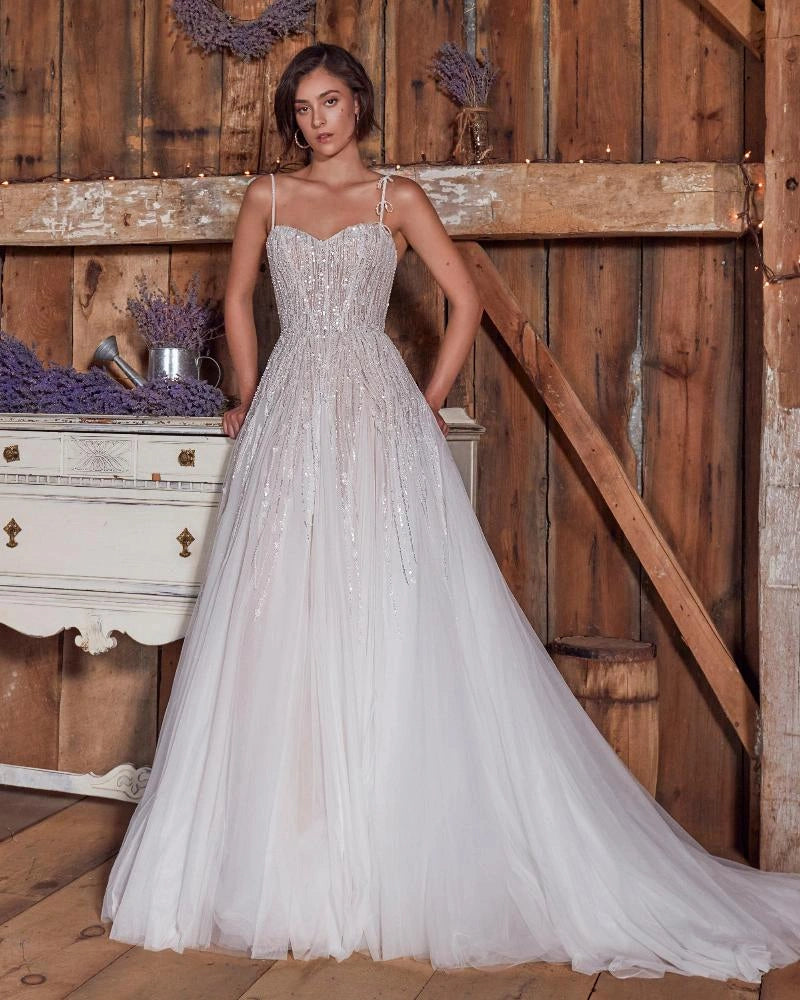 L'amour by Calla Blanche Jasmine is a sparkly tulle A-line wedding dress featuring cascading beading from the bodice onto the skirt! This gown comes to us in great condition from a designer boutique. L'amour by Calla Blanche Jasmine is Ivory/Light Nude in color and a size 14.