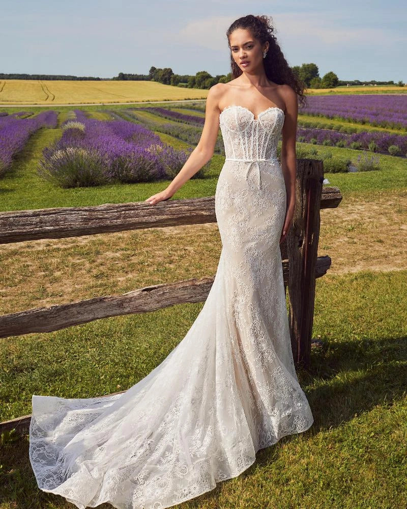 L'amour by Calla Blanche Kenny is a gorgeous lace fit and flare wedding dress featuring a strapless sweetheart neckline! This gown comes to us in great condition from a designer boutique. L'amour by Calla Blanche Kenny is Ivory/Light Nude in color and a size 12.