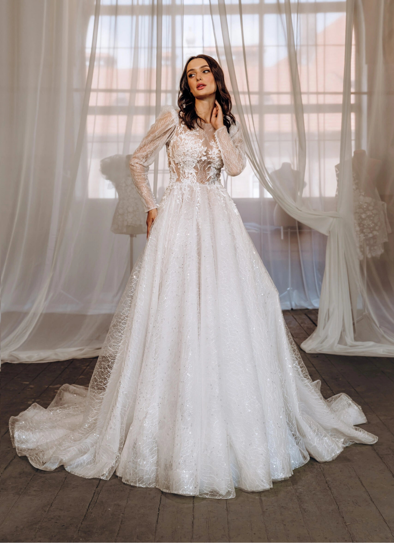 Lana Grace Bridal Grace is a sparkly tulle ball gown featuring lace details + long sleeves! This gown comes to us in great condition from a designer boutique. Lana Grace Bridal Grace is White in color and a European size 38, which fits like a US size 6.