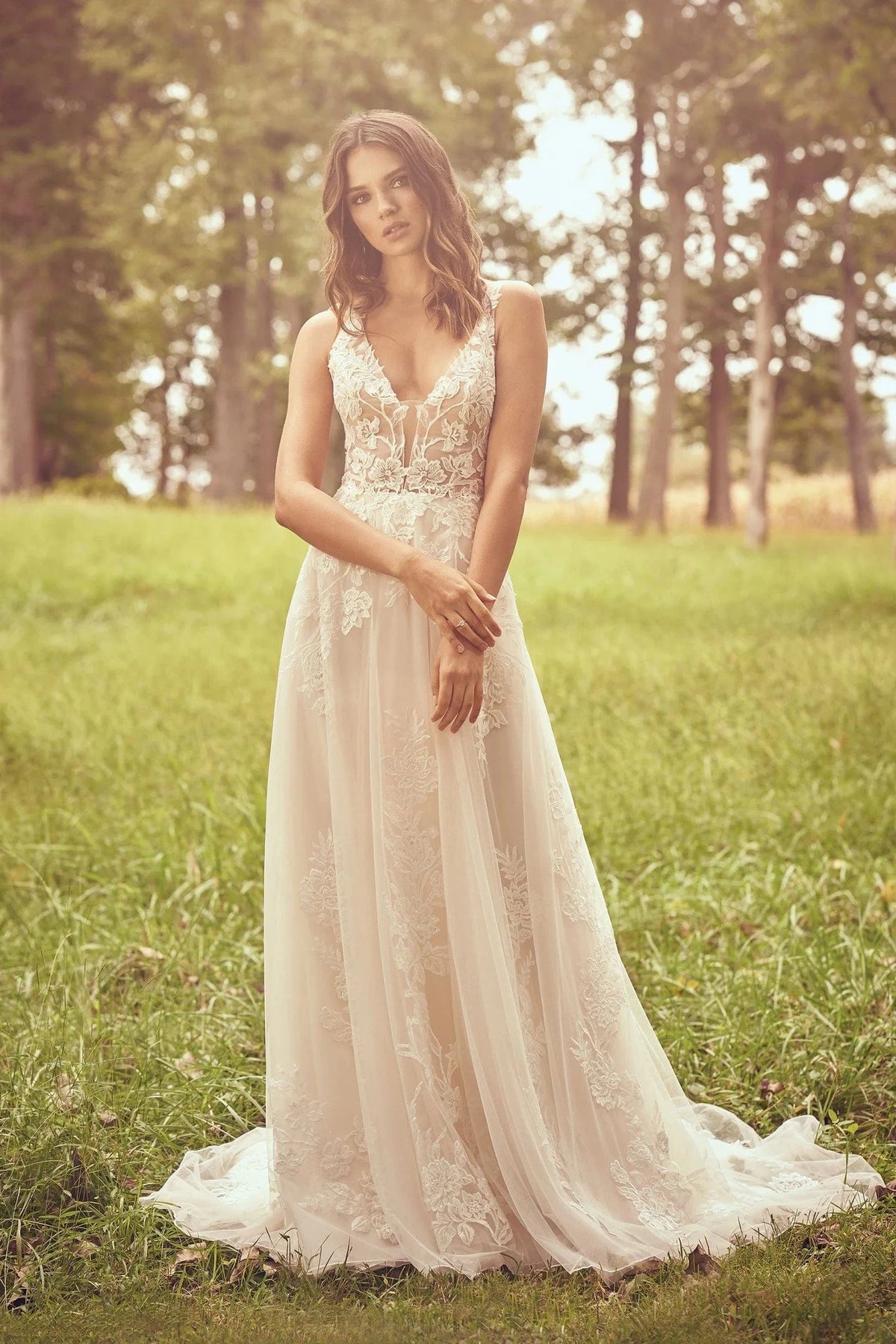 Lillian West 66063 is a feminine tulle A-line wedding dress decorated with floral lace motifs! This gown comes to us in good condition from a designer boutique. Lillian West 66063 is Sand/Ivory/Nude in color and a size 12.
