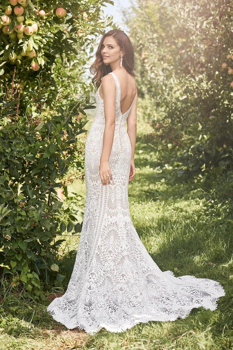 Lillian West 66126 is a bohemian lace sheath wedding dress featuring a V neckline + short train! This gown comes to us in great condition from a designer boutique. Lillian West 66126 is Nude/Ivory/Nude in color and a size 22.