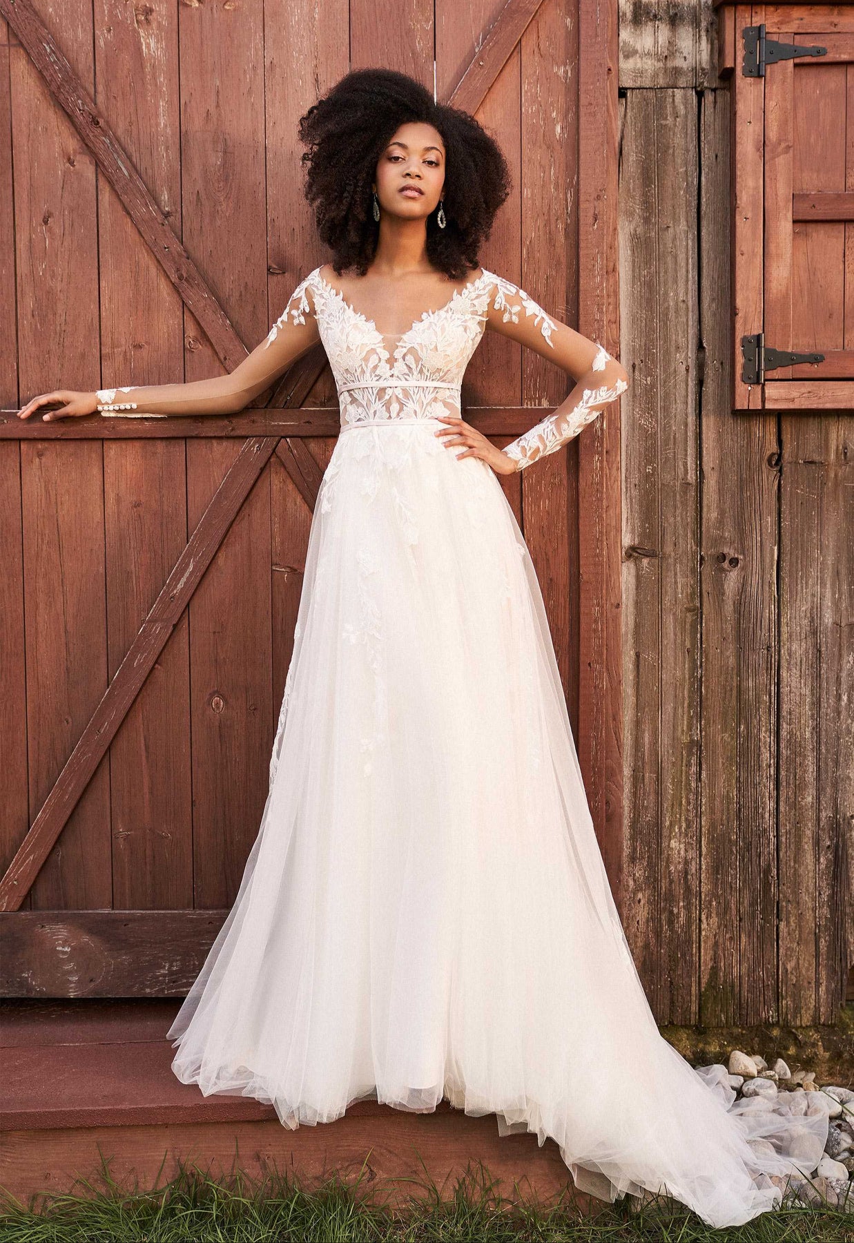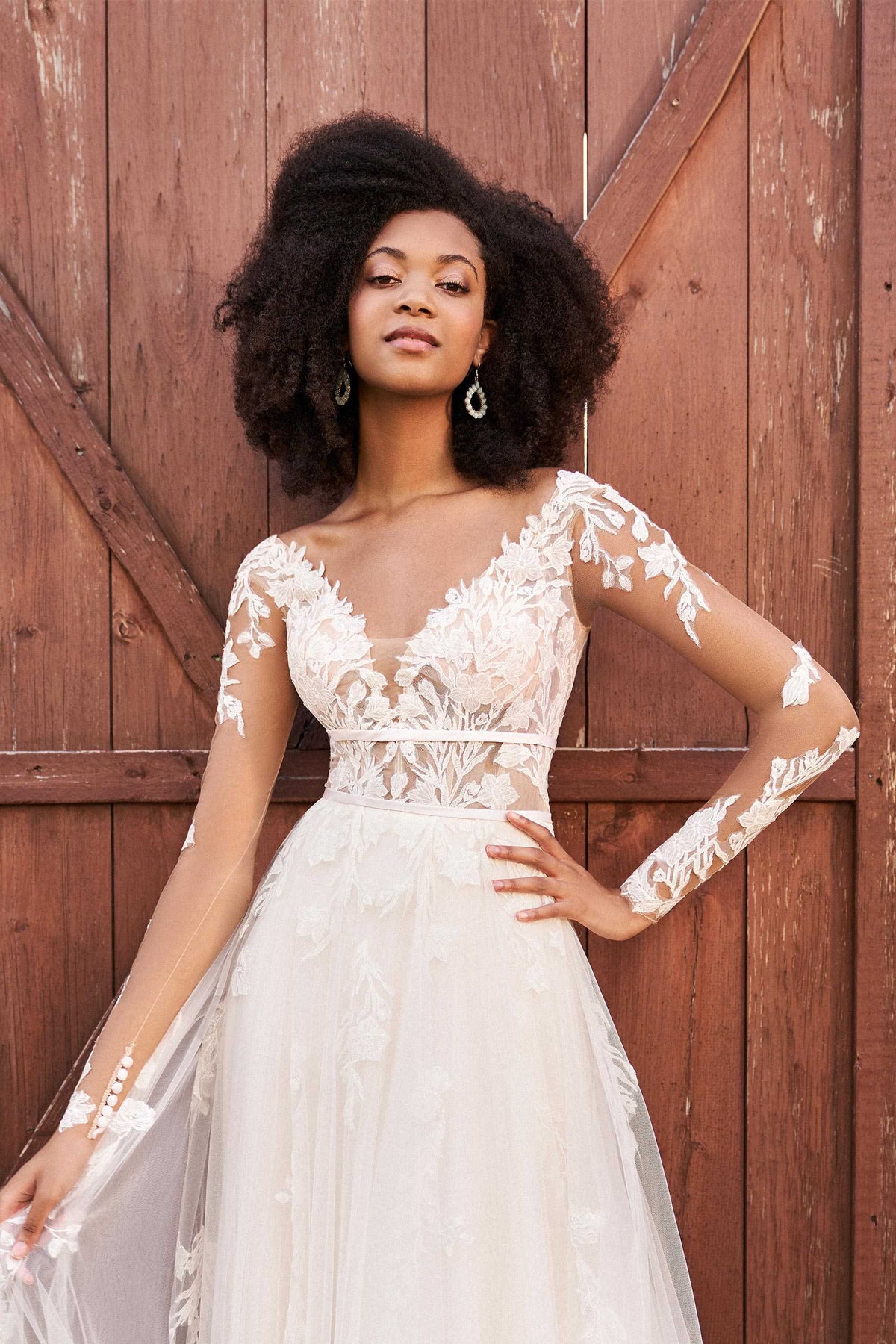 Lillian West 66192 is a graceful tulle A-line wedding dress! The V neckline is framed by sheer long sleeves with floral details. This gown comes to us in great condition from a designer boutique. A cup needs retacked. Lillian West 66192 is Sand/Ivory/Nude in color and a size 18.
