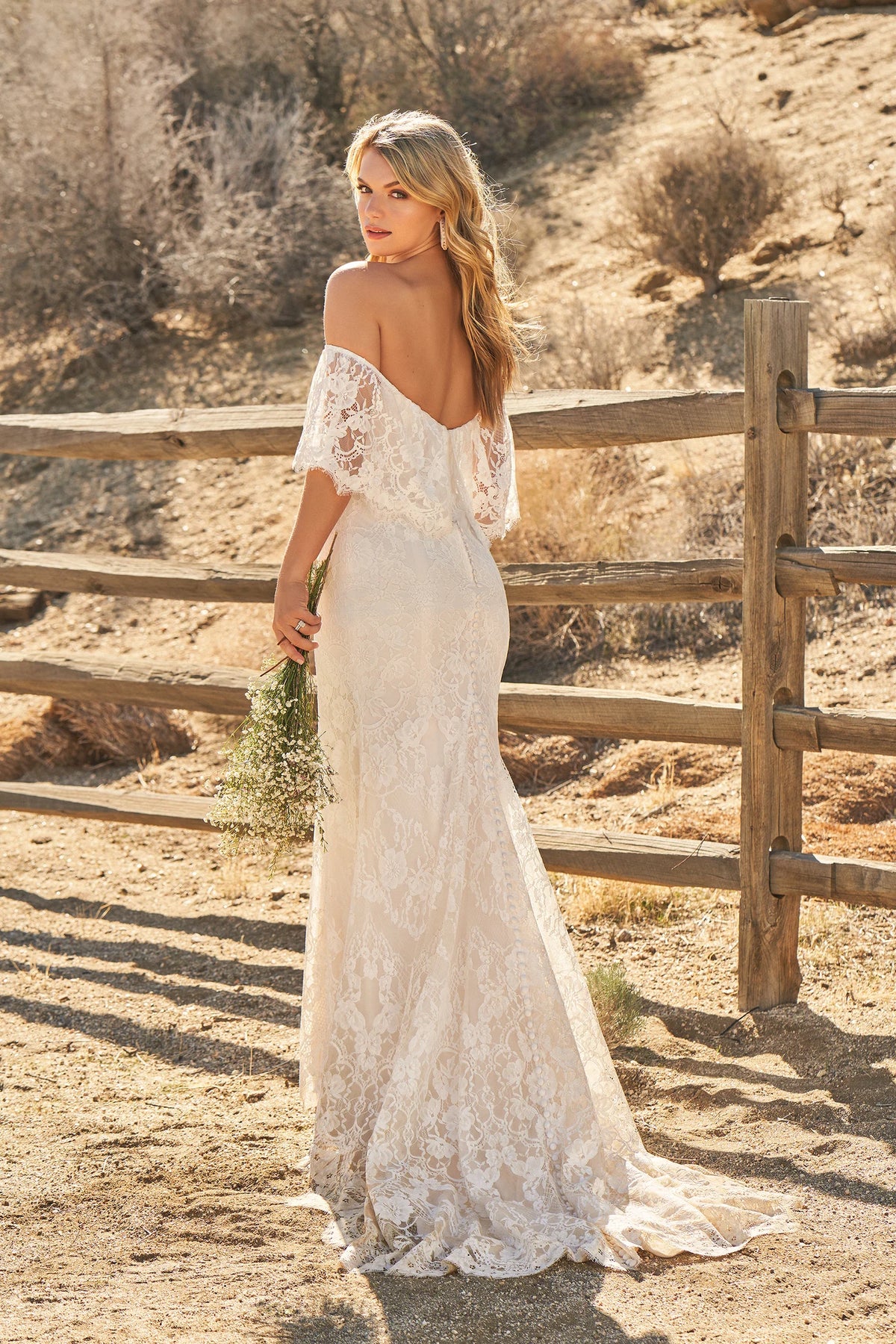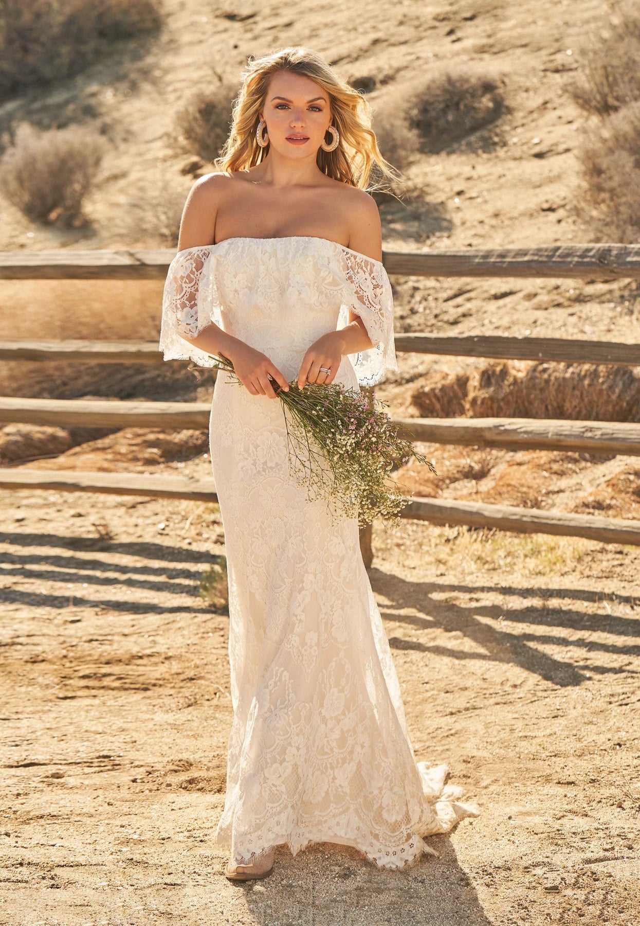 Lillian West 66258 is a vintage lace sheath wedding dress featuring an off-the-shoulder neckline with ruffled sleeves! This gown comes to us in great condition from a designer boutique. Lillian West 66258 is Sand/Ivory in color and a size 10.