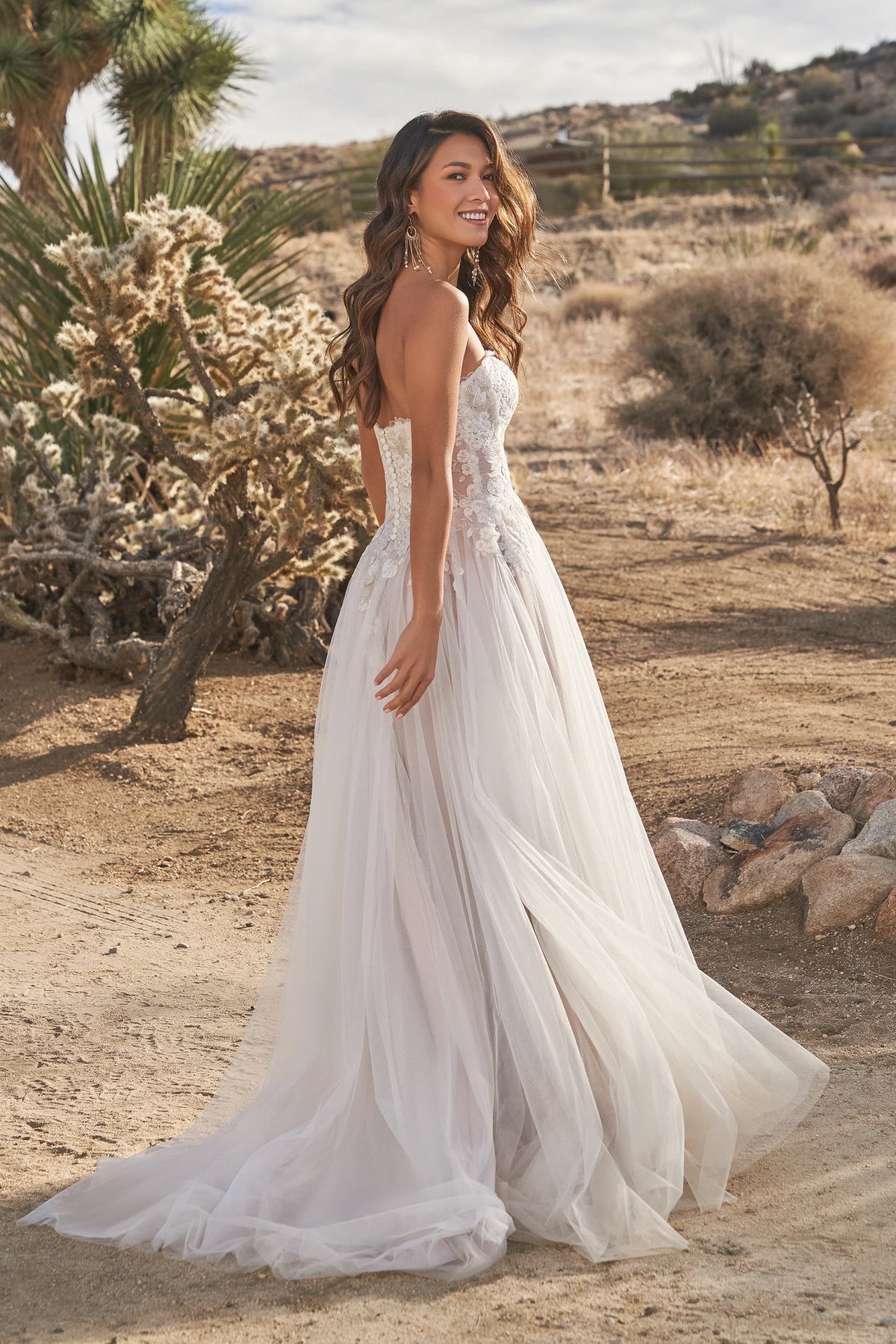 Lillian West 66266 is a breezy tulle A-line wedding dress featuring lace details on the bodice! This gown comes to us in great condition from a designer boutique. Lillian West 66266 is Mocha/Ivory/Gold in color and a size 14.