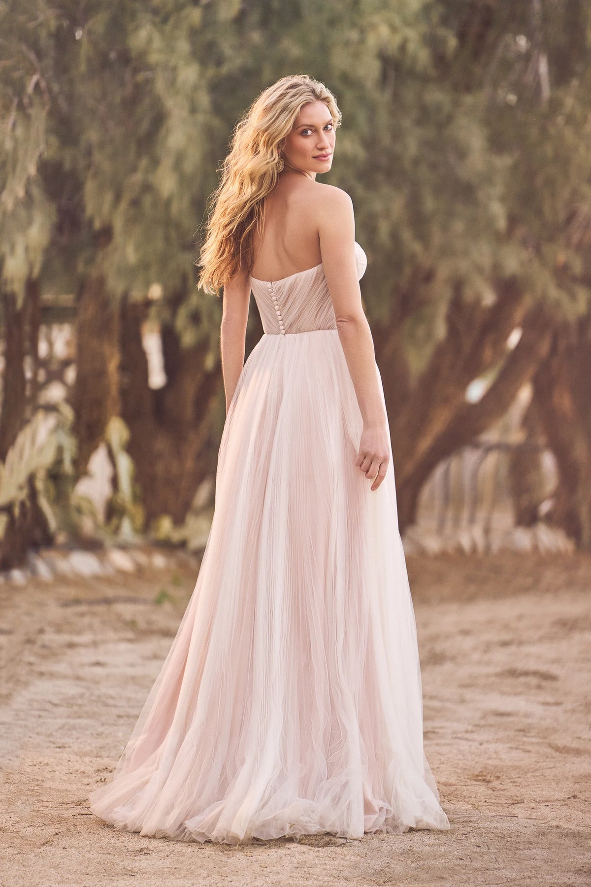 Lillian West 66315 is a gorgeous tulle A-line wedding dress featuring a sculpted sweetheart bodice + wispy skirt! This gown comes to us in good condition from a designer boutique. There are small hole on the hem, + a missing hook + button. Lillian West 66315 is Sand/Ivory/Latte in color and a size 14.